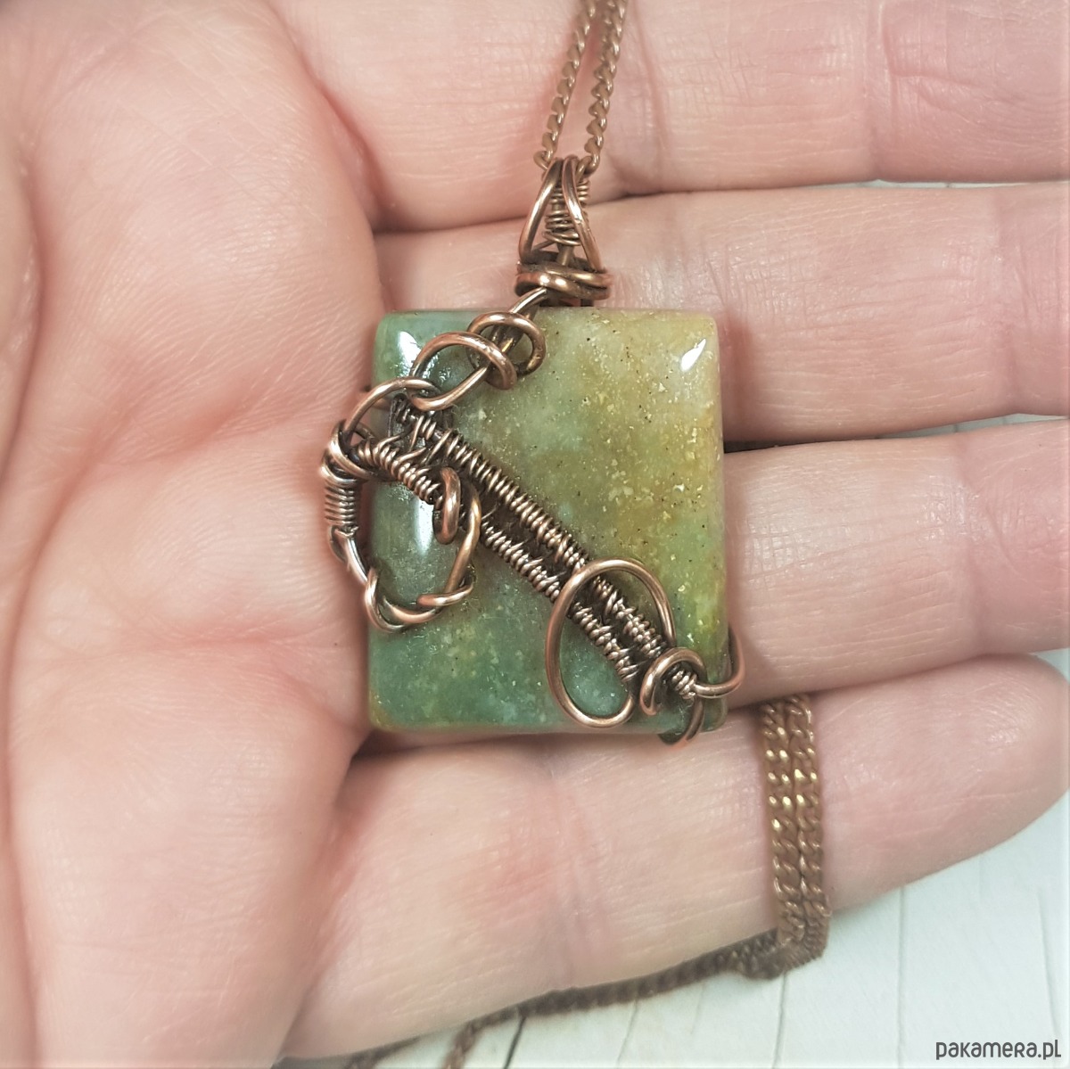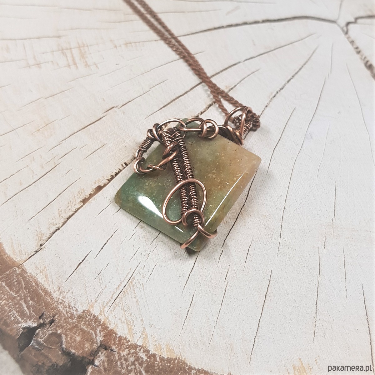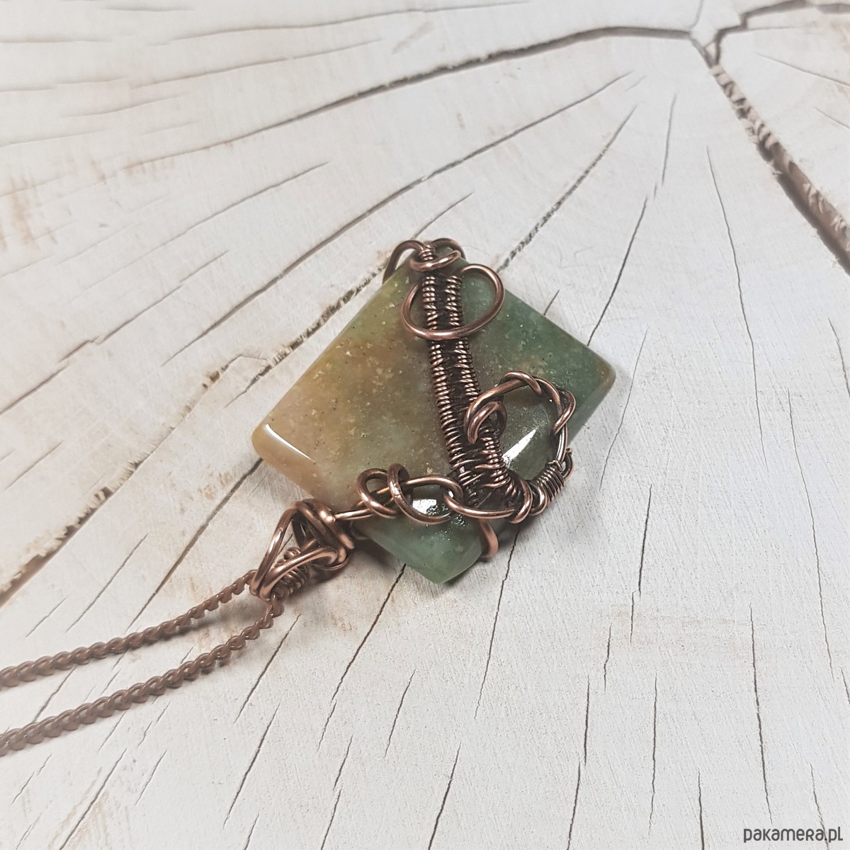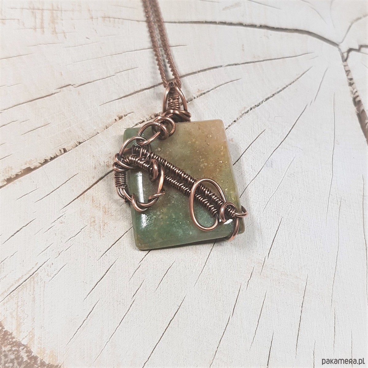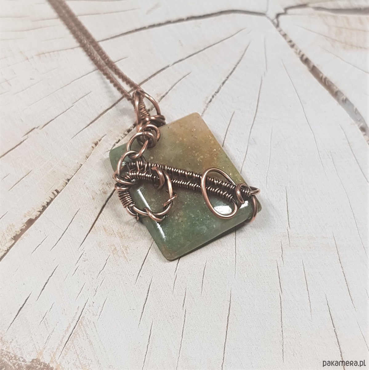 Naszyjnik zrobiony ręcznie w miedzi pracochłonną techniką wire-wrappingu którego głównym elementem jest agat w naturalnych odcieniach zielono piaskowego. Wymiary zawieszki 40x27 mm, zawieszony na łańcuszku standardowej długości około 50cm. Wisiorek jest oksydowany i następnie wypolerowany w celu uzyskania szlachetnego efektu postarzenia, jest niemały, ale delikatny, ma stonowane, eleganckie wybarwienie.
