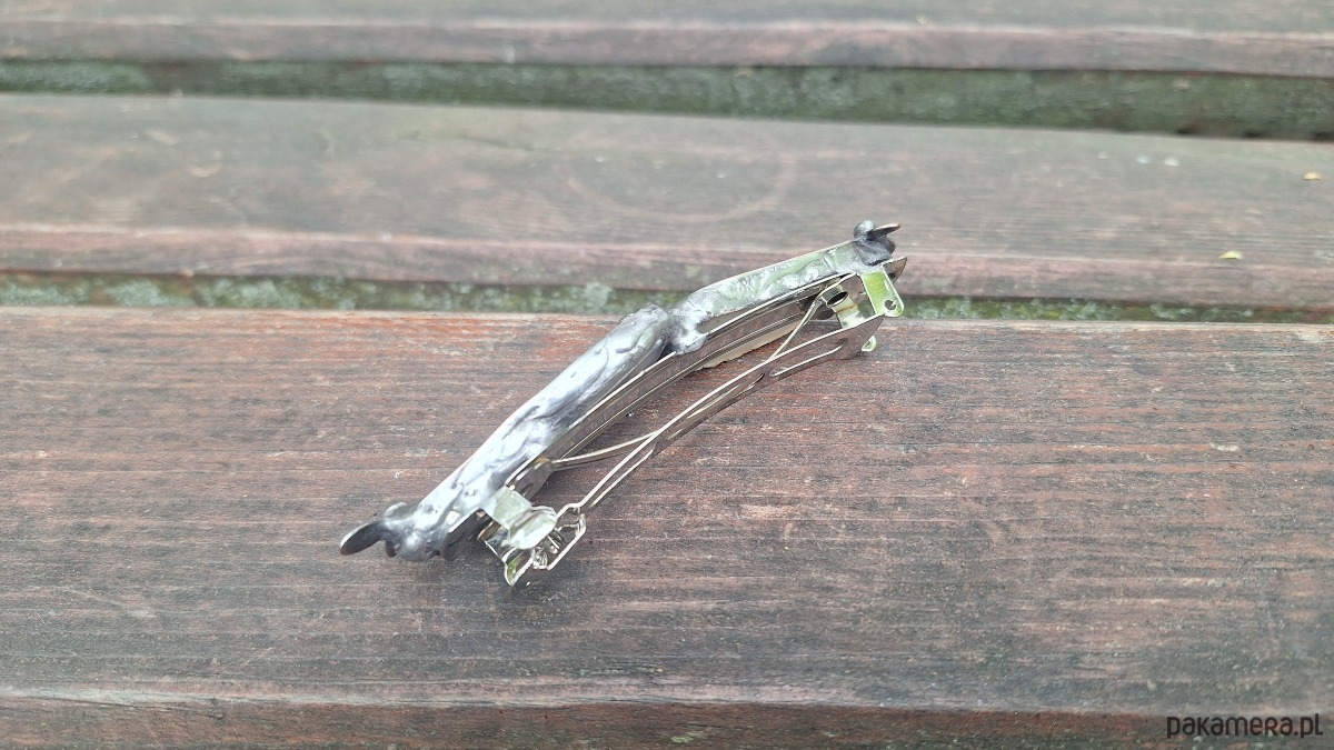 Klamra do włosów, wykonana z miedzi, cyny i agatów. Wymiary ok. 8 na 2 cm. Zapięcie 6 cm, metalowe.