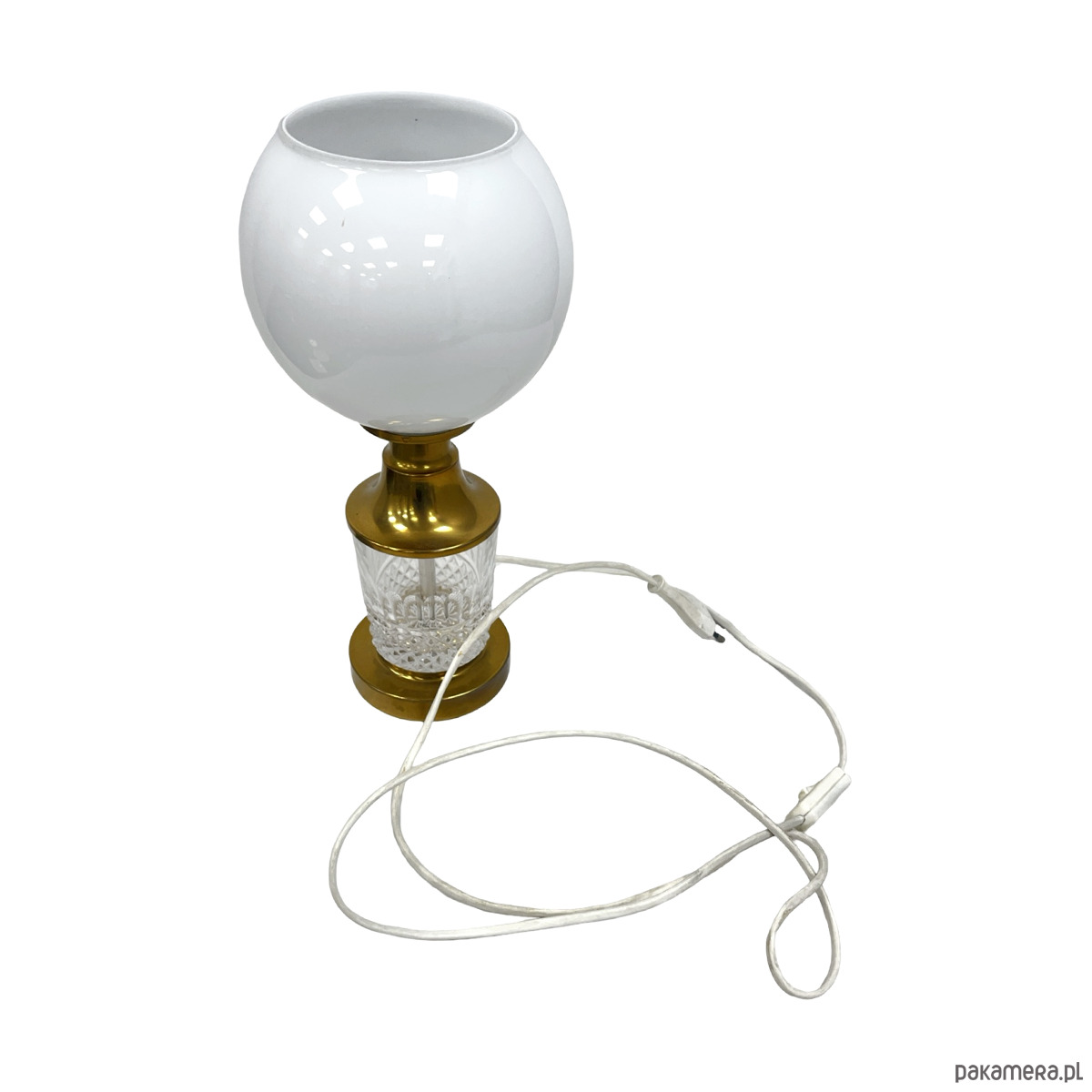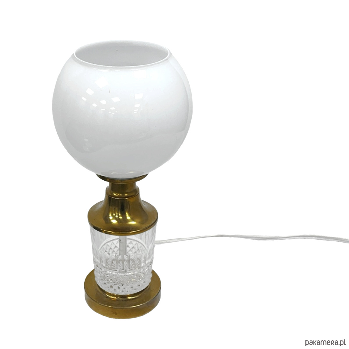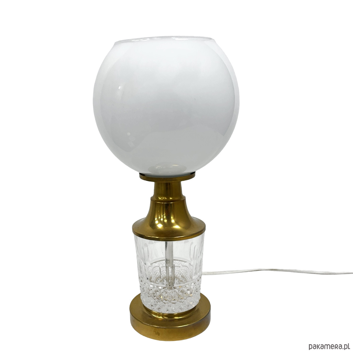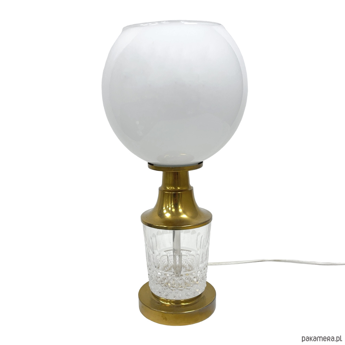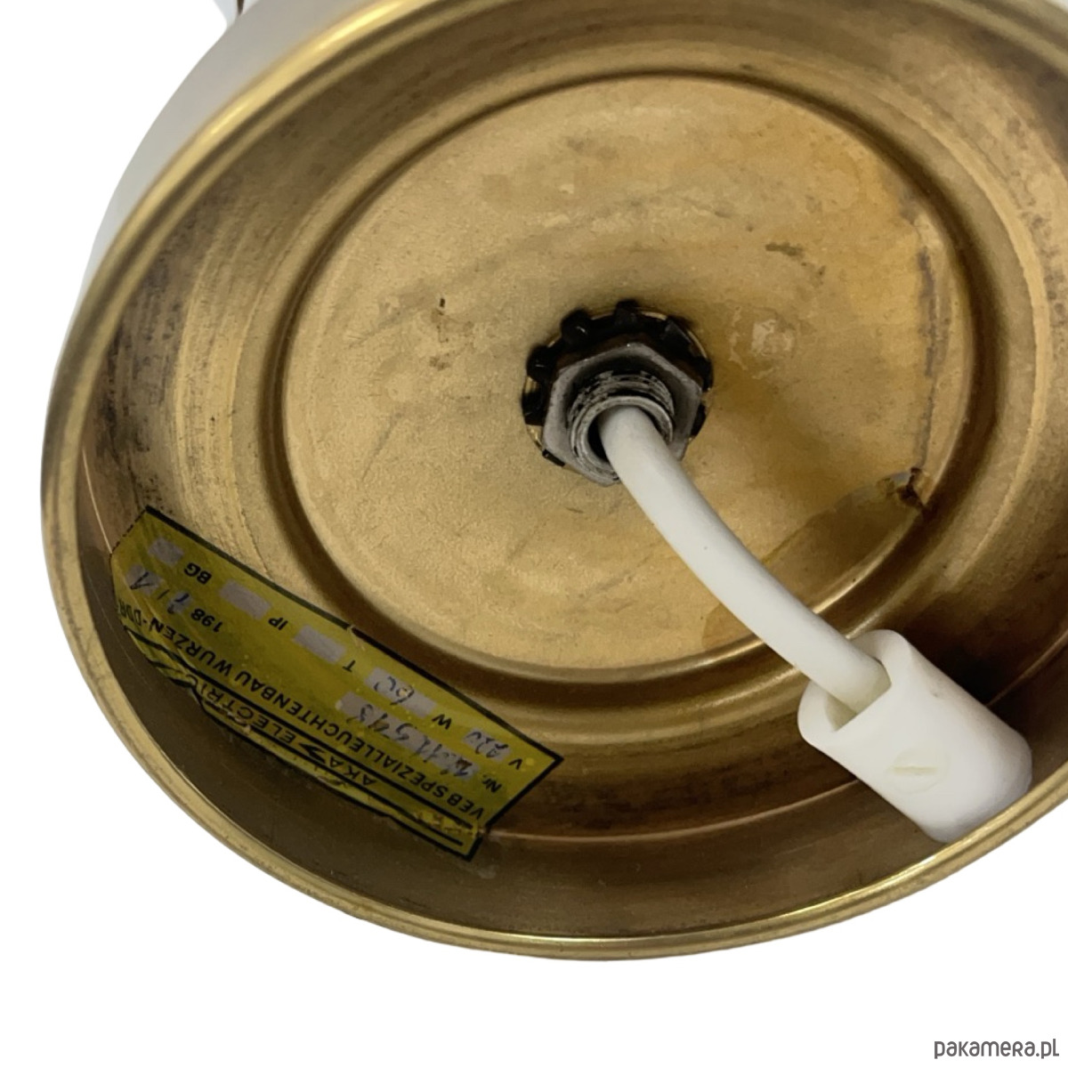 Klosz bez pęknięć i wyszczerbień. Kryształowa podstawa czysta, bez uszkodzeń. Mosiądz z delikatną, naturalną patyną adekwatną do wieku przedmiotu. Instalacja sprawna.