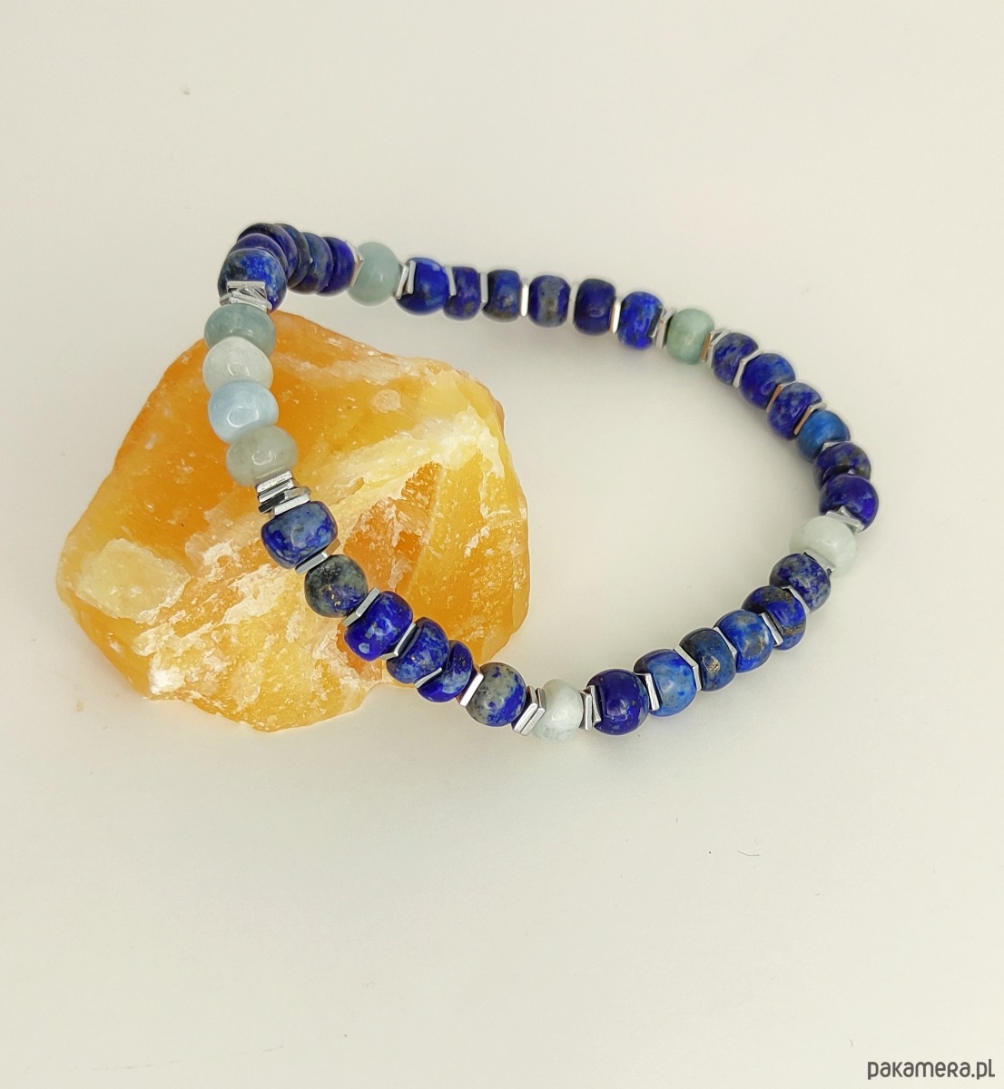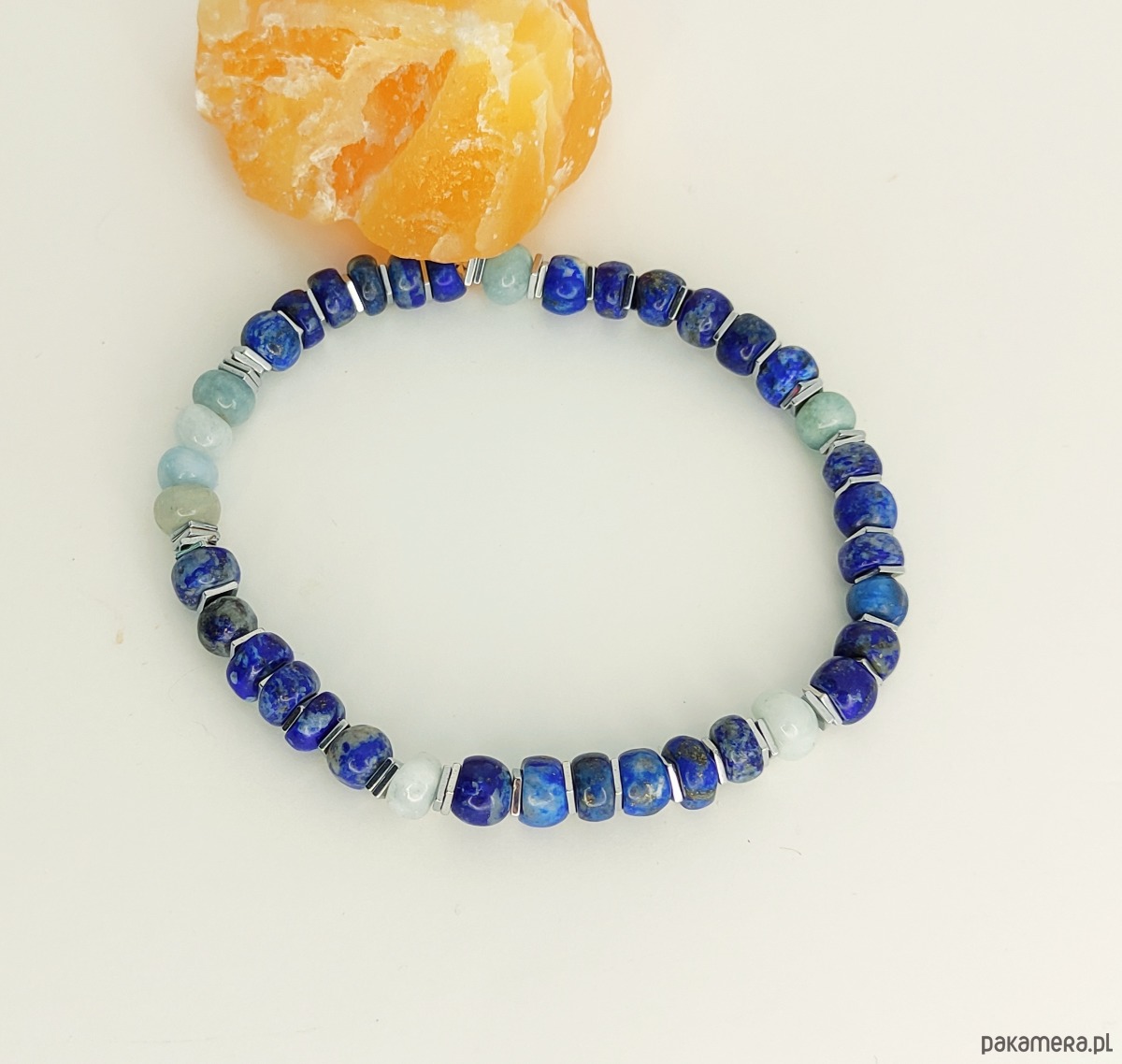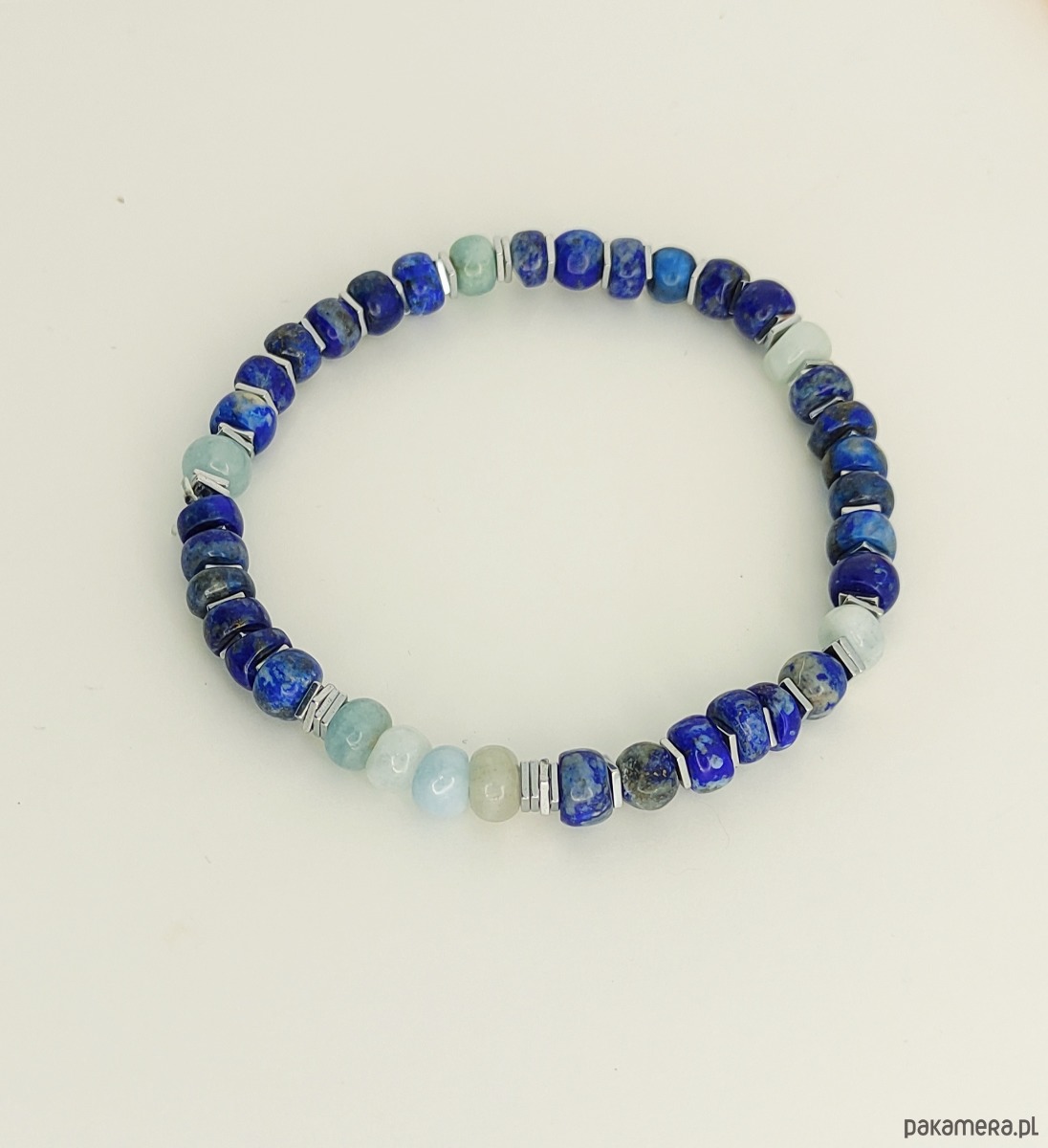 Bransoletka z grubo ciosanych krążków lapis lazuli i kamienia jasnoniebieskiego akwamarynu (średnica 6-7 mm). Poszczególne elementy są porzekładane kwadratowymi krążkami hematytu. Całość na wygodnej, mocnej elastycznej gumce.