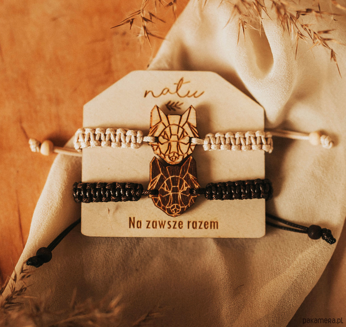 Bransoletki umieszczone są na drewnianej podkładce, starannie zapakowane w kraftowe pudełko, wypełnione ekologicznym siankiem