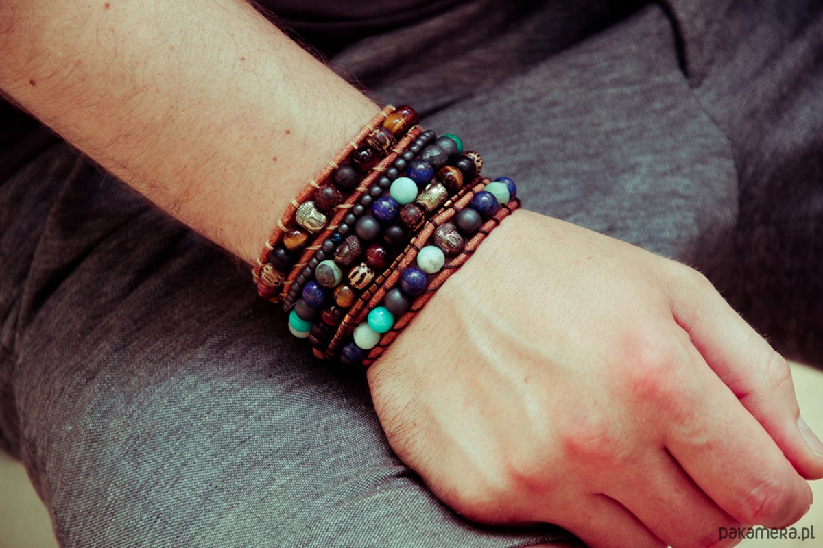 zestaw bransoletek z hematytu, drewna i kwarcu