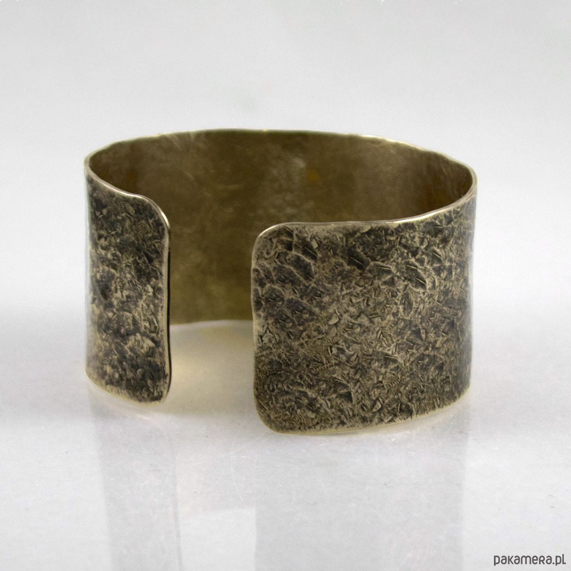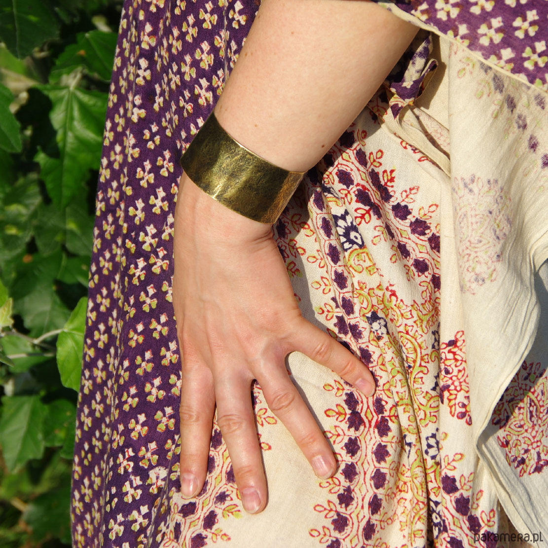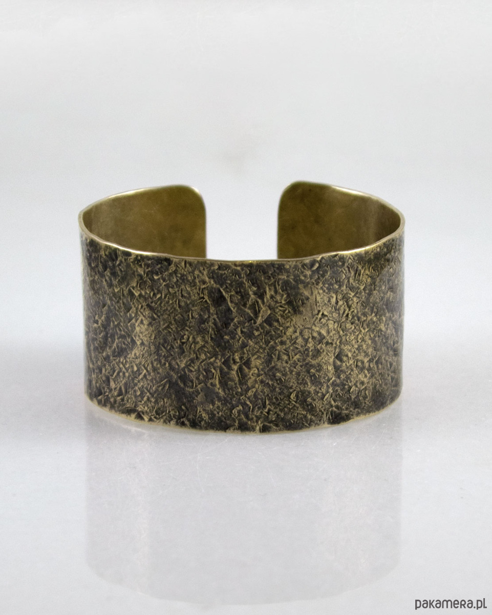 Bransoletka została wykonana w całości z mosiądzu, ma ok 3 cm szerokości. Wzór jest lekko podkreślony ciemną patyną uzyskaną w procesie oksydacji (bez użycia sztucznych barwników).
