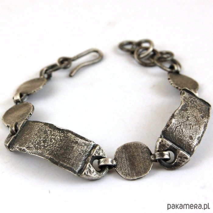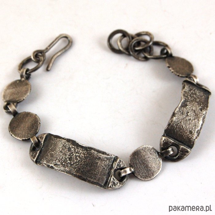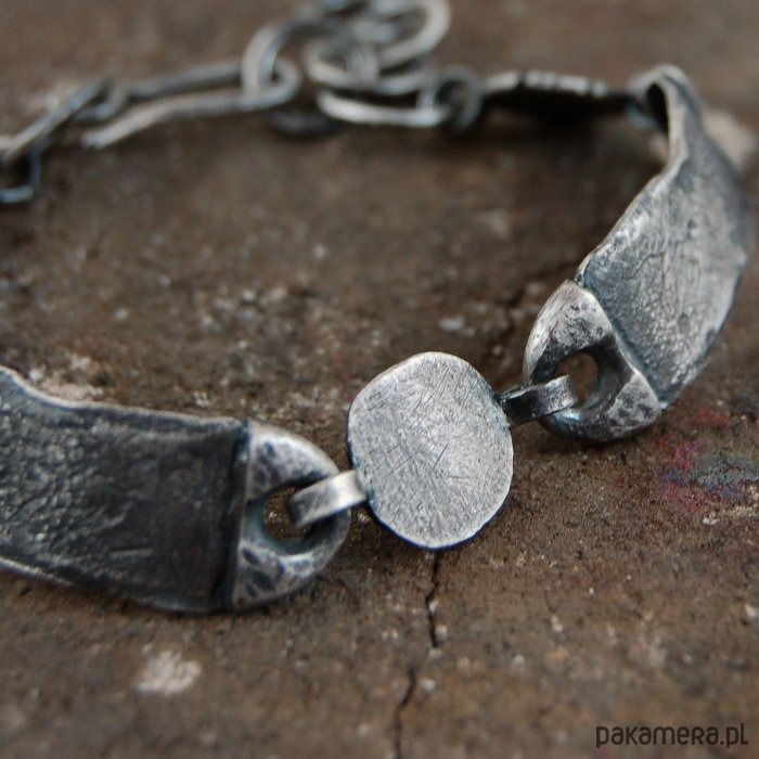 Męska bransoleta z kutego, oksydowanego srebra. Szerokość srebrnych elementów 1,1 - 1,2 cm, obwód bransolety 17 - 20 cm.