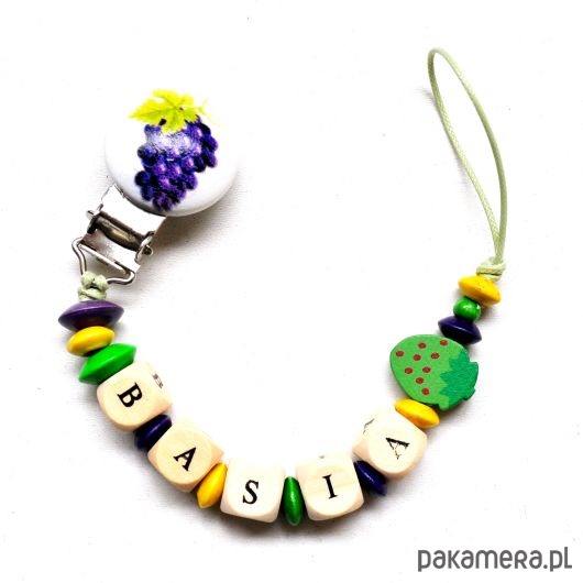 Piękna, spersonalizowana zawieszka do smoczka z drewnianych elementów, atestowanych, bezpiecznych dla dziecka z imieniem.