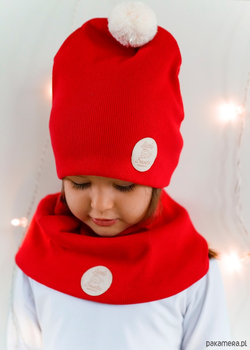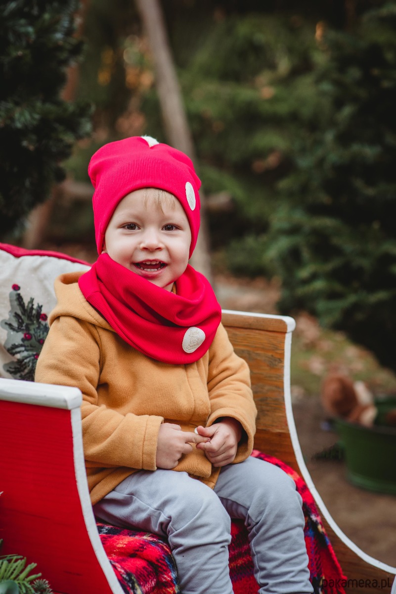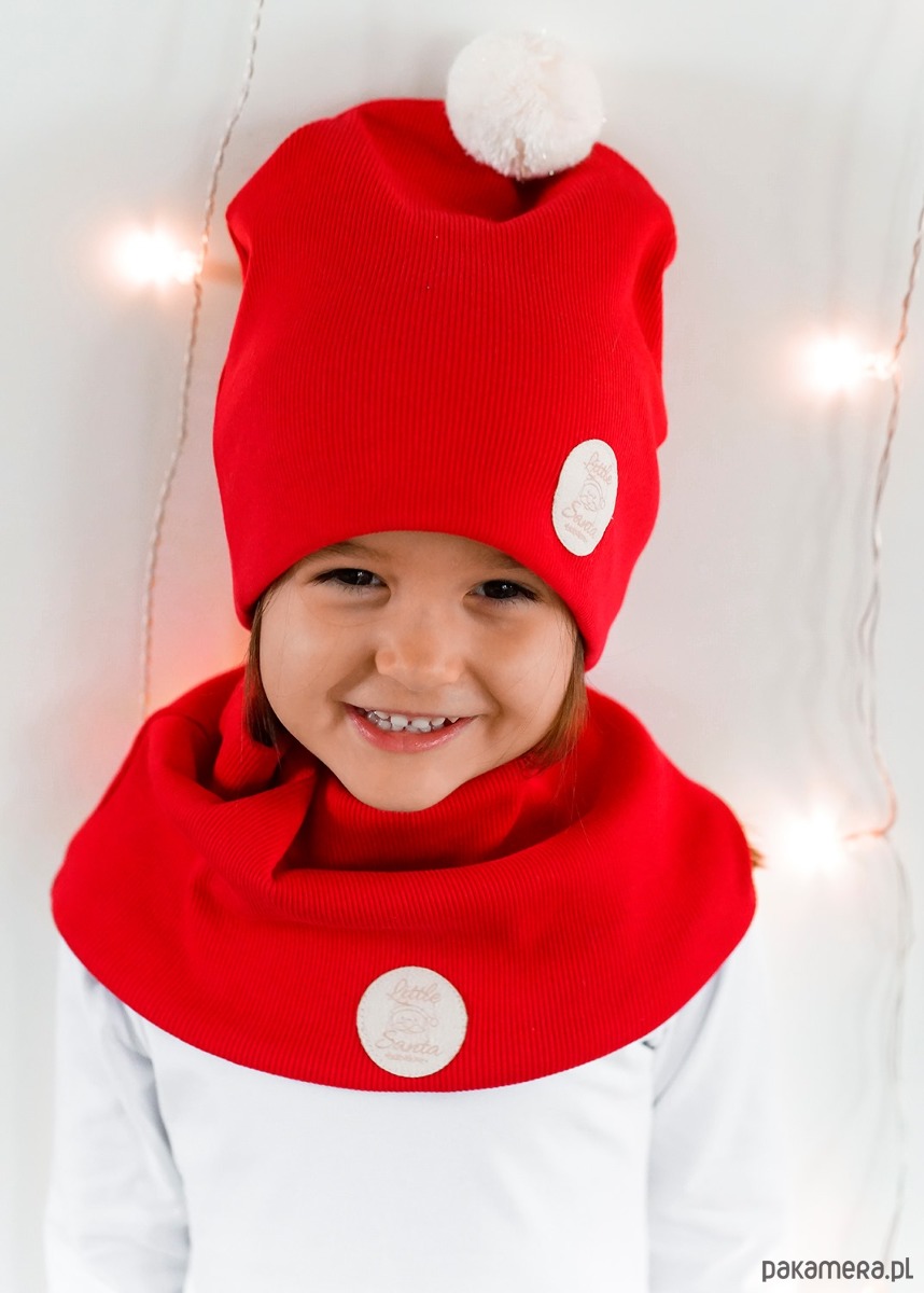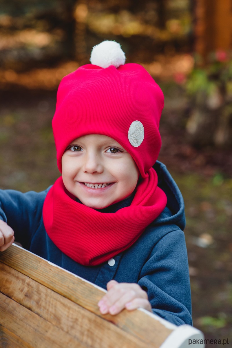 Czapka zimowa dziecięca z kominem uszyta z podwójnej warstwy materiału w kolorze czerwonym. Uszyta w 96% z dzianiny bawełnianej z 4% dodatkiem elastanu. Bawełna ma doskonałe właściwości cieplne, a więc zapewnia doskonałą cyrkulację powietrza, przy czym jest wyjątkowo miękka i miła w dotyku, ponadto dodatek elastanu zapewnia idealne dopasowanie czapki do głowy dziecka. Podwójna warstwa dzianiny sprawia, że zestaw idealnie sprawdza się na zimowa porę. Dodatkowo zastosowane przez nas dzianiny cechują się wysoką wytrzymałością przy zachowaniu naturalnych właściwości bawełny.