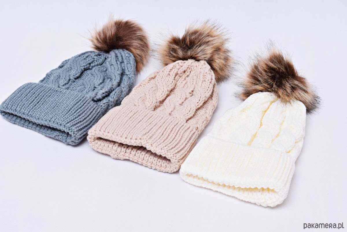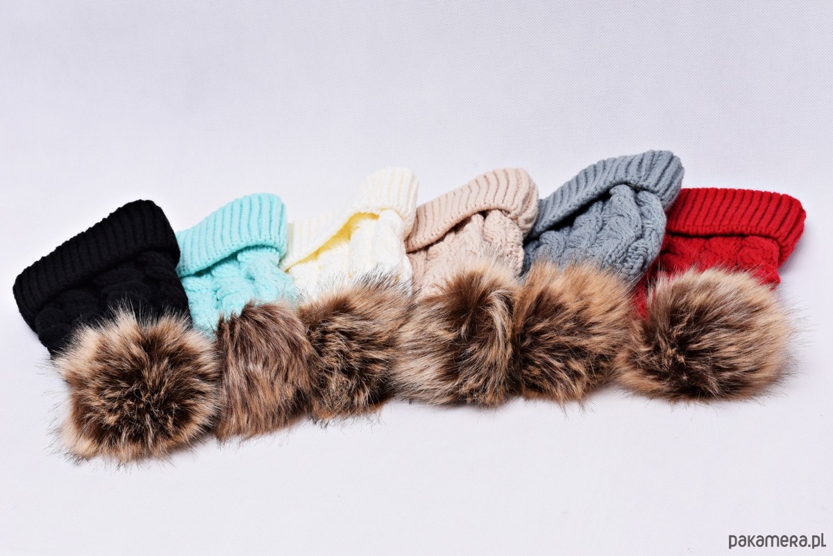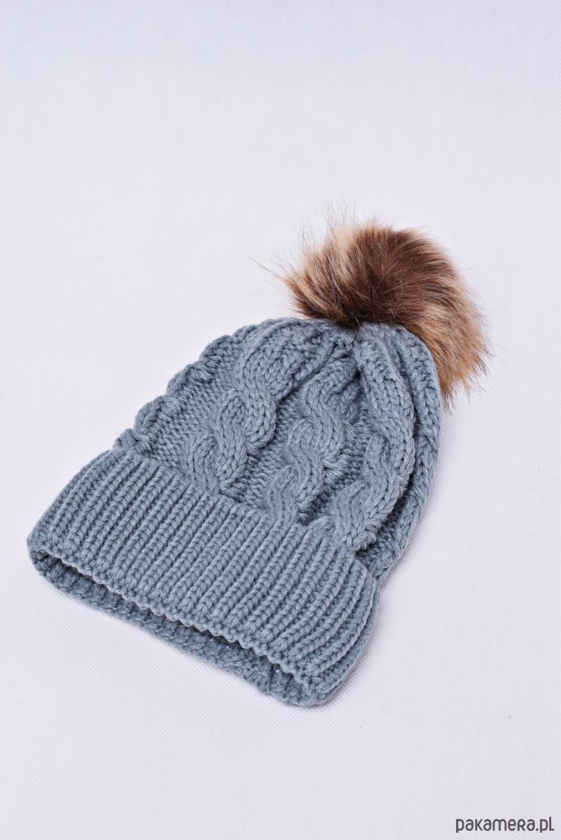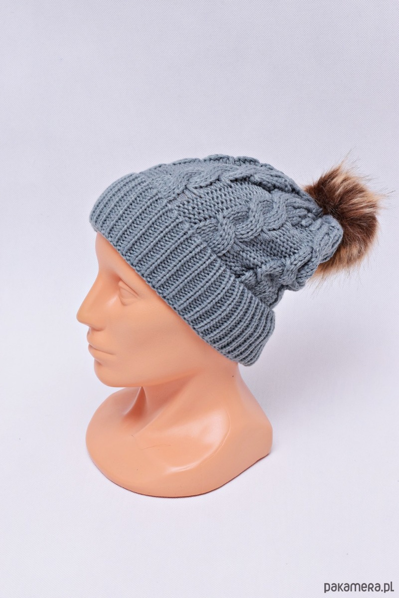 Czapka ciepła, zimowa, z pomponem. Kolor szary. Pompon zrobiony jest ze sztucznego futerka ekologicznego.
