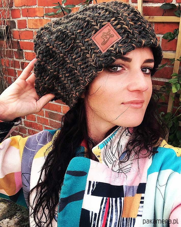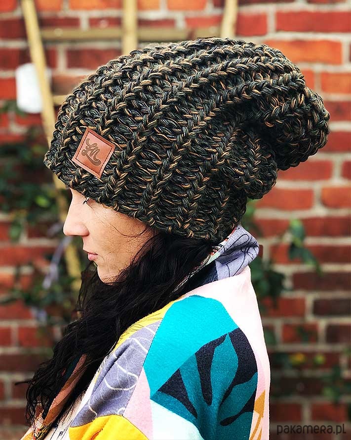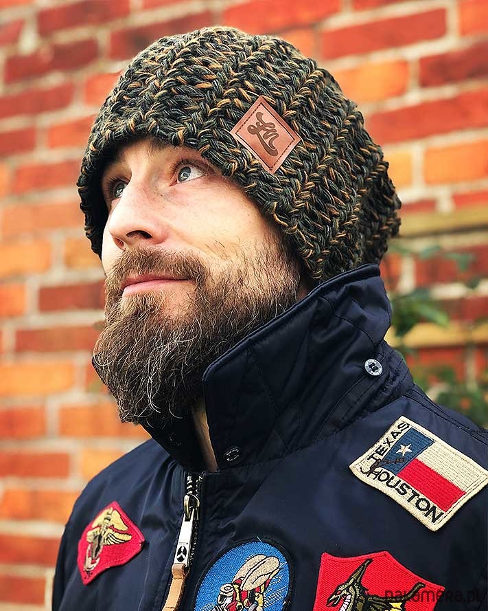Czapka męska / czapka damska zimowa khaki. Duza czapka dziana na jesień/zimę. Doskonale grzeje, pięknie wygląda, produkcja w 100% polska. Na przodzie naszywka Łap Nas.
