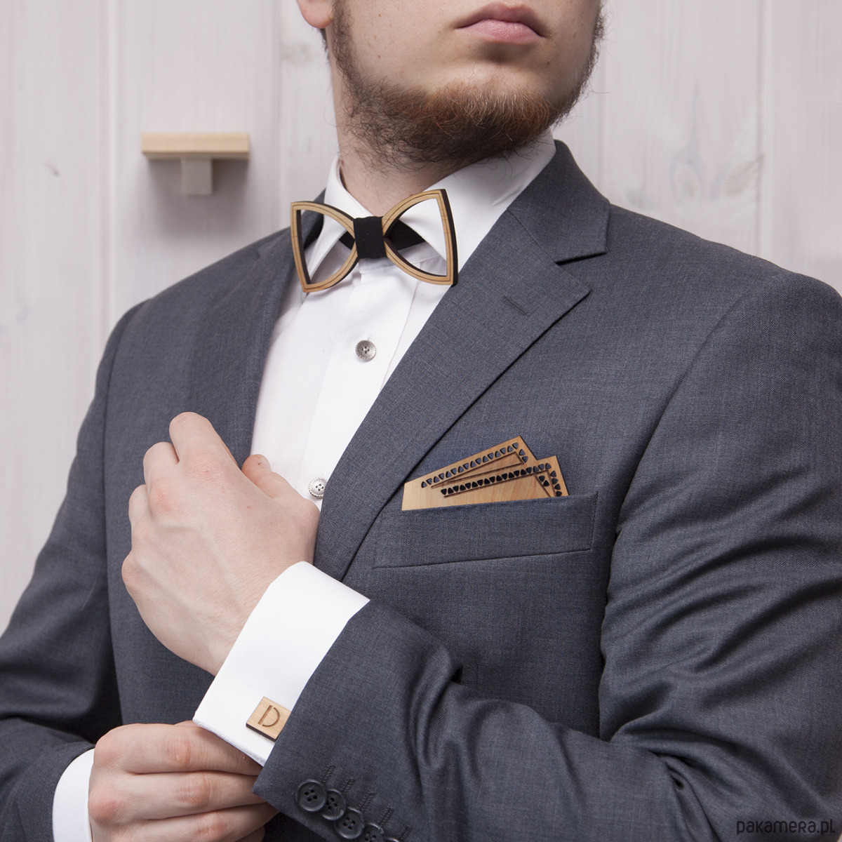 Drewniana muszka, ozdobiona grawerem.