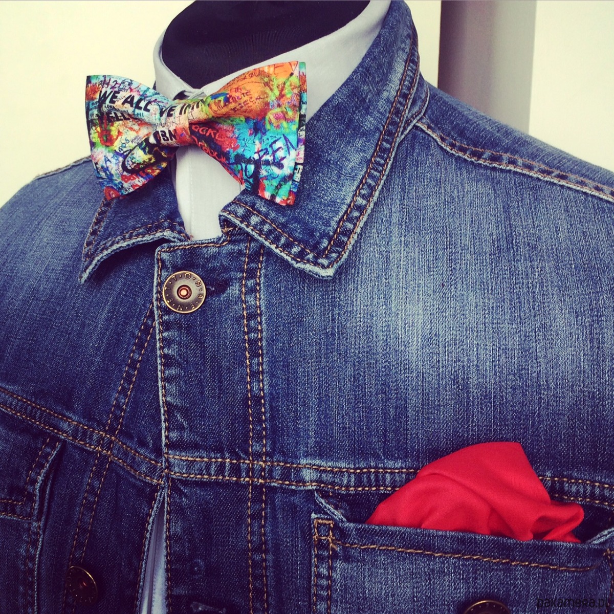 Grafika została zaprojektowana przez zespół marthu. Kolorowy nadruk został wykonany na 100% bawełnie przy użyciu nowoczesnej metody druku, który nie zmienia struktury tkaniny.Każda mucha posiada wygodne zapięcie na pasku oraz regulację obwodu. Najmniejszy możliwy obwód paska to 34 cm, a największy to 44 cm.