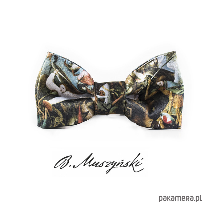 Muszka przedstawiająca fragment obrazu autorstwa Pietera Bruegela zatytułowany: "Upadek zbuntowanych aniołów". Muszka wykonana jest z najwyższą dbałością o szczegóły. Dzięki nowoczesnej metodzie nanoszenia projektu na tkaninę otrzymaliśmy perfekcyjną głębię barw i nasycenie kolorów. Wymiary muszki to 6 na 12 cm. Muszka posiada płynną regulację obwodu paska do długości 48 cm.Muszka jest opakowana w eleganckie pudełko z tłoczeniem.