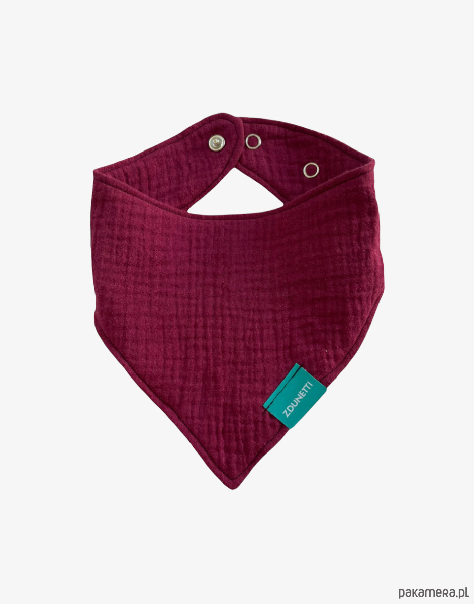 Chusta z miękkiego muślinu dla dziecka zapinana na regulowane metalowe napy.