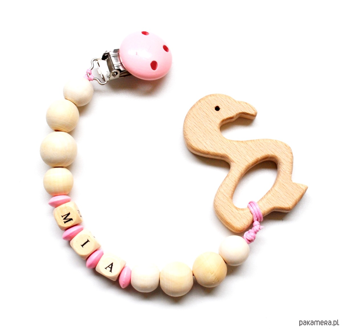 Unikatowy imienny gryzak z atestowanych drewnianych elementów bezpiecznych dla dziecka z jednej strony z klipsem, z drugiej strony z bezpiecznym do gryzienia dla dziecka flamingiem.