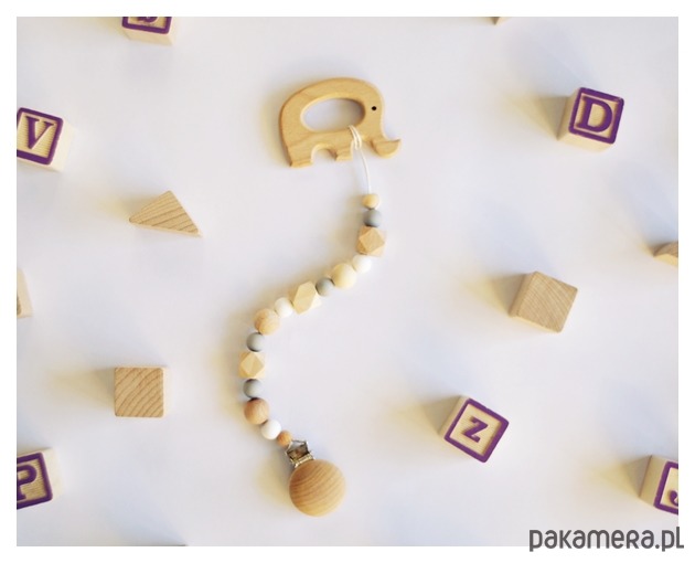 Zawieszka wykonana jest z silikonowych i drewnianych koralików nawleczonych na wytrzymały, bawełniany sznurek. Zakończona jest naturalnym drewnianym klipsem, który nie zniszczy ubranek malucha. Gryzak i drewniane koraliki wykonane są z naturalnego drewna liściastego (buk i/lub klon).