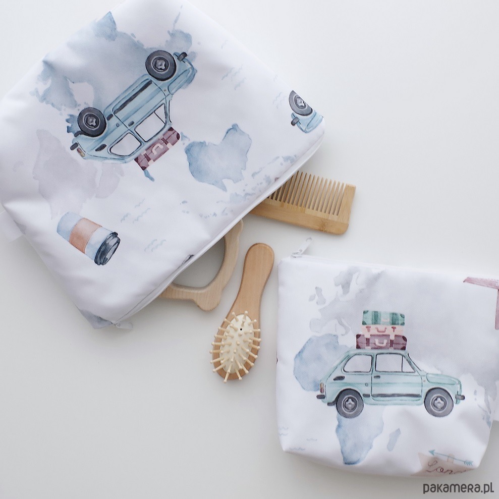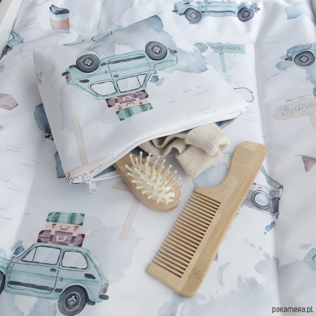 Kosmetyczka w akwarelowe auta i aparaty fotograficzne. Pomieści pieluszki, krem, szczoteczkę oraz inne akcesoria dla maleństwa lub jego mamy. Uszyta z wodoodpornego poliestru z bawełnianą podszewką w kolorze khaki.