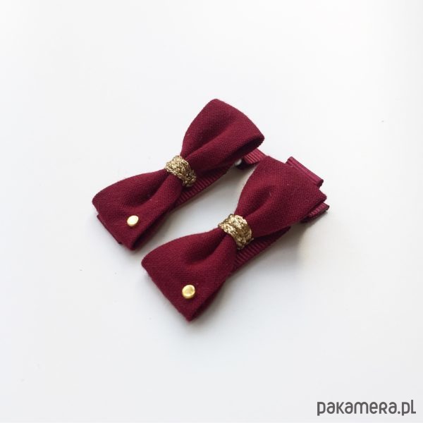 Komplet dwóch spinek do włosów ozdobionych bawełnianą kokardką i nitką. Spinka typu klips fryzjerski 1cm x 4,5 cm. Dla dziewczynek w każdym wieku.