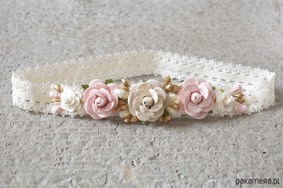 Wykonany z różowych, beżowych i kremowych kwiatków na elastycznej kremowej koronce.