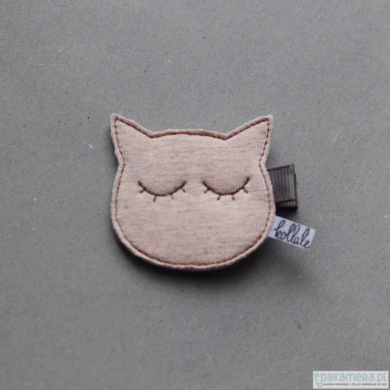 autorski projekt spinka z bawełnianym kotkiem; wyszywane oczka, krotek o wymiarach 4,5 x 4,5cm; klips: aligator o dł 4,5 cm; bajkowa