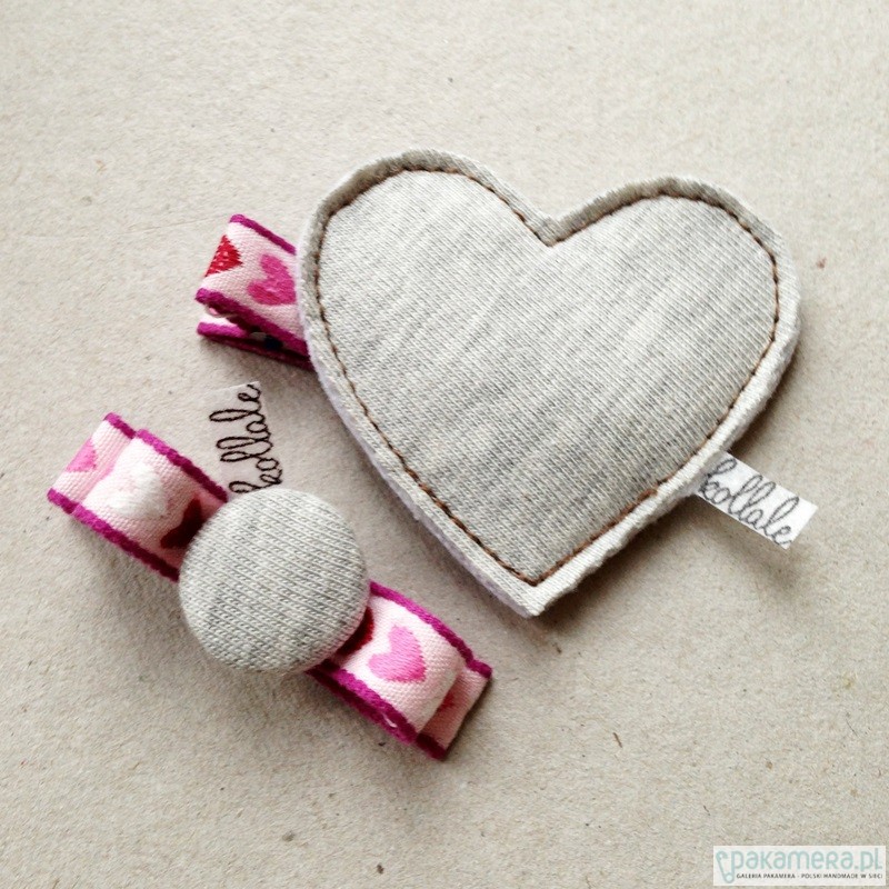 autorski projekt spinka ozdobiona tasiemką w serduszka w komplecie ze spinką z bawełnianym sercem na klipsie o dł 4,5 cm