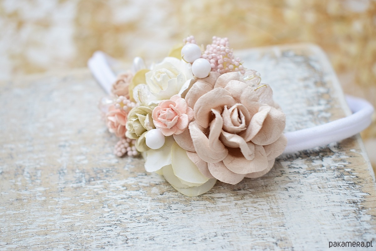 Śliczny i dziewczęcy wianuszek w kolorystyce nude pink, kremowej biel oraz herbacianego różu.