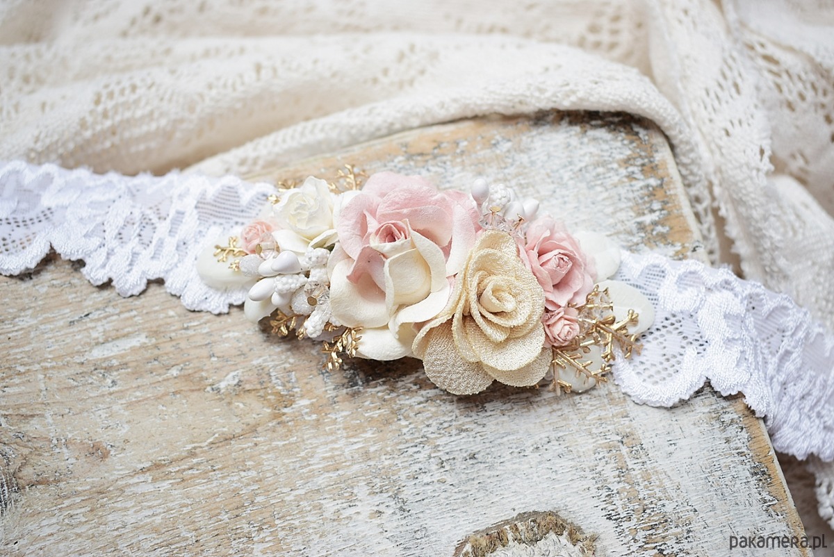 Przepiękny, delikatny wianuszek w kolorystyce kremowo różowej z dodatkiem złota.