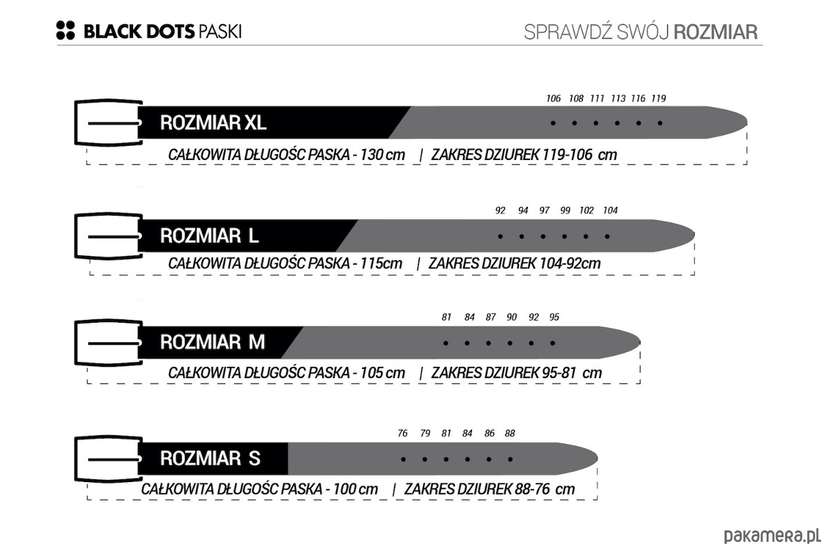 Pasek pakowany w eleganckie kartonowe pudełko z białą etykietą Black Dots