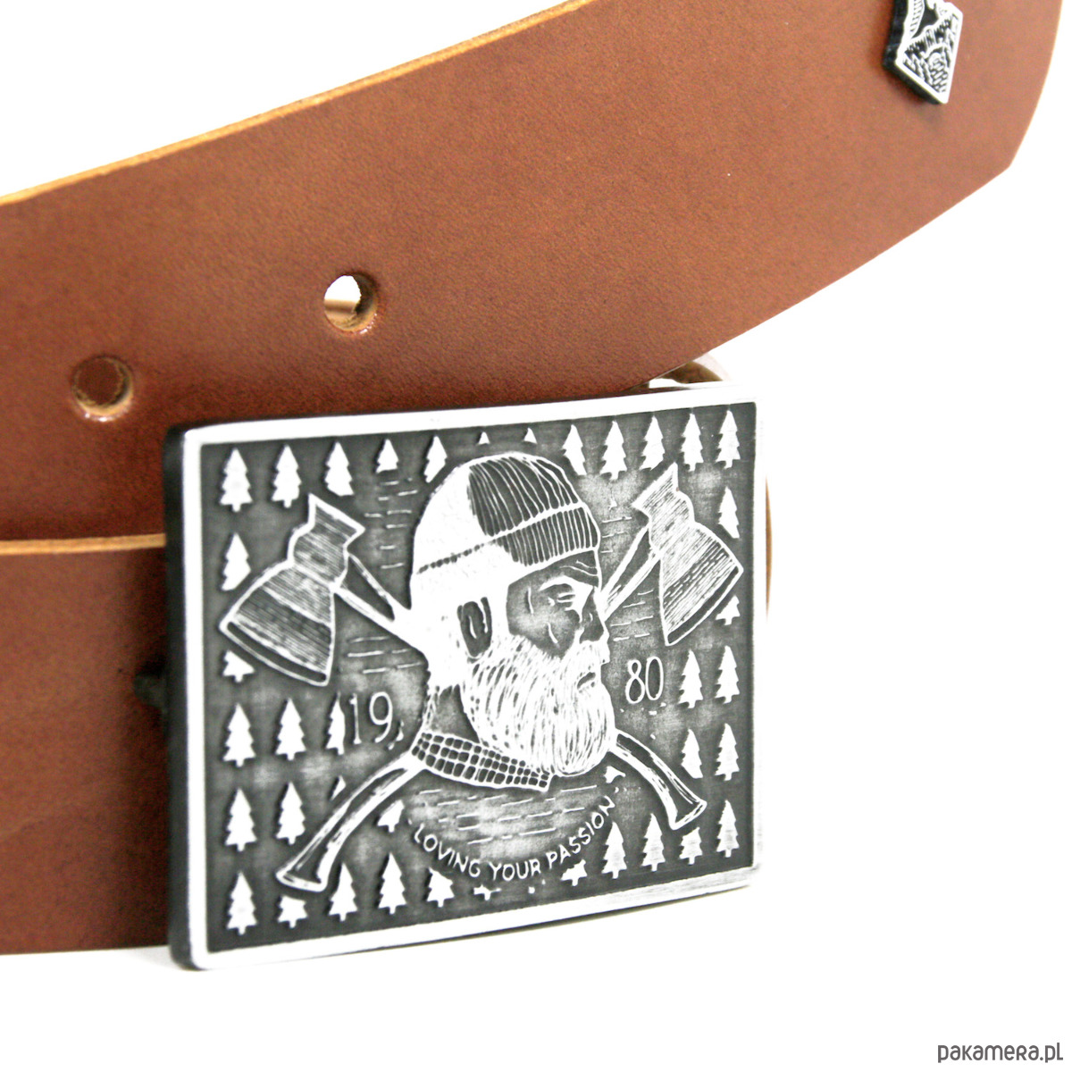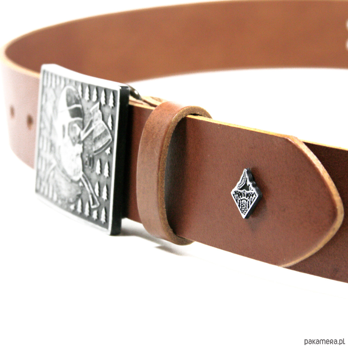 Pasek Drwal wykonany z wysoko gatunkowej włoskiej skóry klasy premium w kolorze brązowym. Ręcznie wykonywany w Polsce, wycinany z jednego płata skóry. Klamra ręcznie przecierana, dzięki czemu każda sztuka ma indywidualną strukturę rys. Na końcu paska metalowe logo Black Dots.