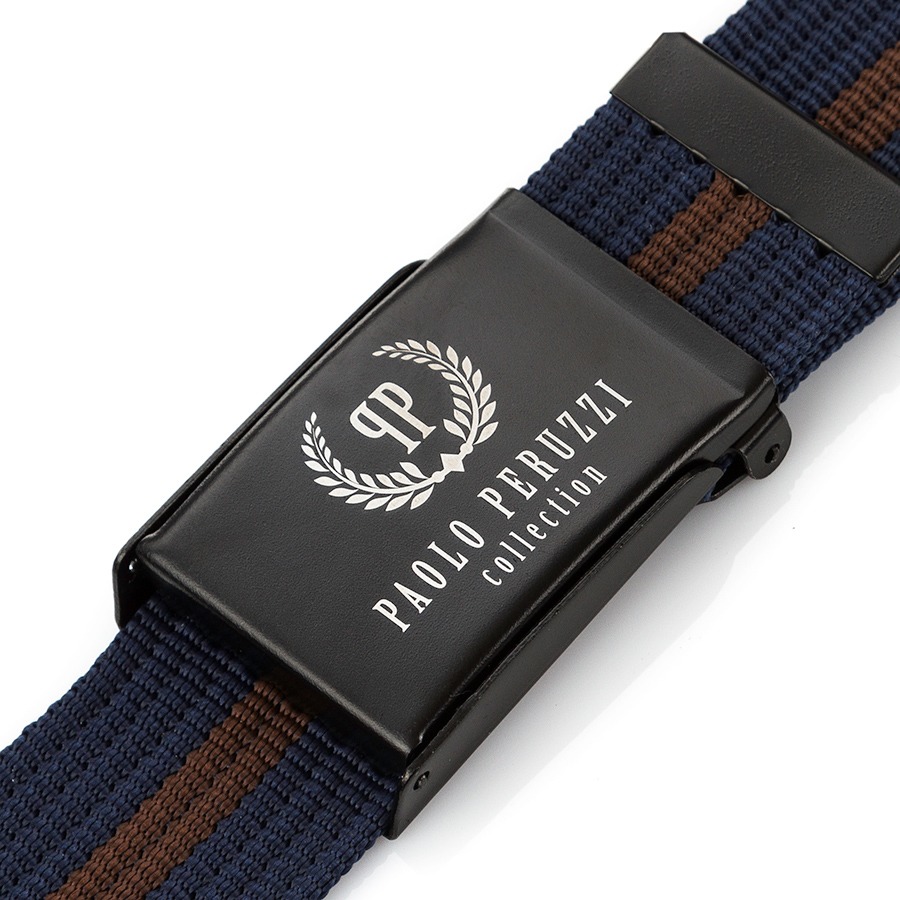 Uniwersalny pasek parciany znakomicie dopełni każdy strój codzienny. Pasek męski jest w barwach granatu oraz brązu, co sprawia, że doskonale dopasuje się do różnych stylizacji. Produkt pochodzi z marki Paolo Peruzzi, której logo jest umieszczone na stalowej klamrze.