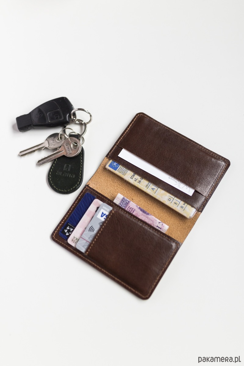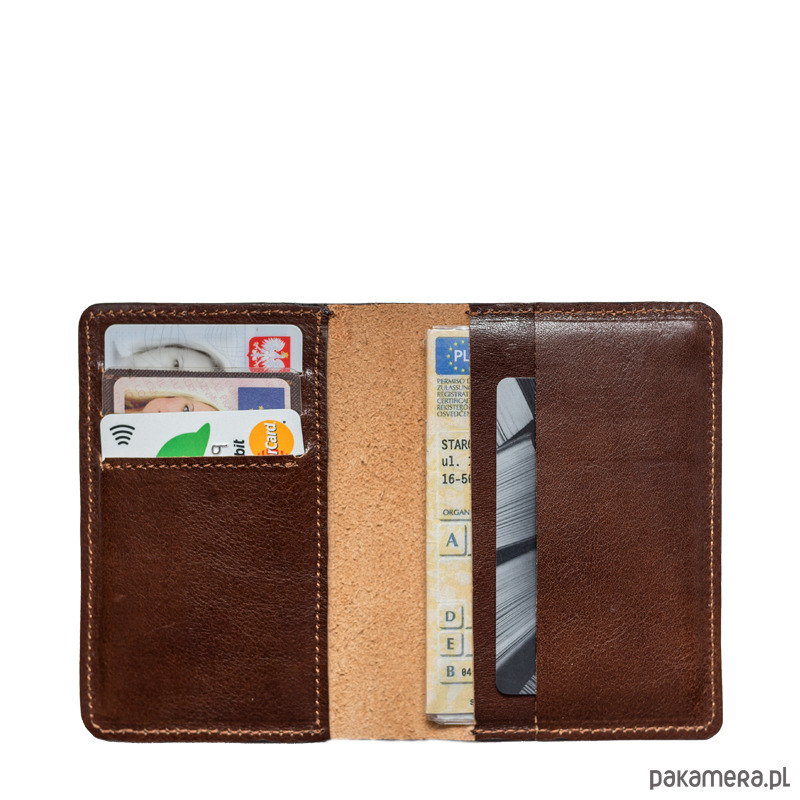 Portfel na dowód rejestracyjny uszyty z naturalnej, roślinnie garbowanej skóry w kolorze brązowym. Etui może posłużyć jako portfel posiada 3 kieszonkami na karty oraz dodatkową kieszonką na np. zwinięte banknoty. Świetna alternatywa na tradycyjny portfel za równo dla Panów jaki i dla Pań.