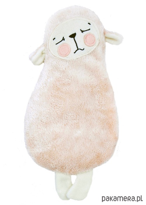 Owieczka uszyta jest z dzianiny futerkowej w kolorze jasniutkiego beżu. W brzuszku ma woreczek wypełniony pestkami z wiśni. Jej wysokość to 31 cm.