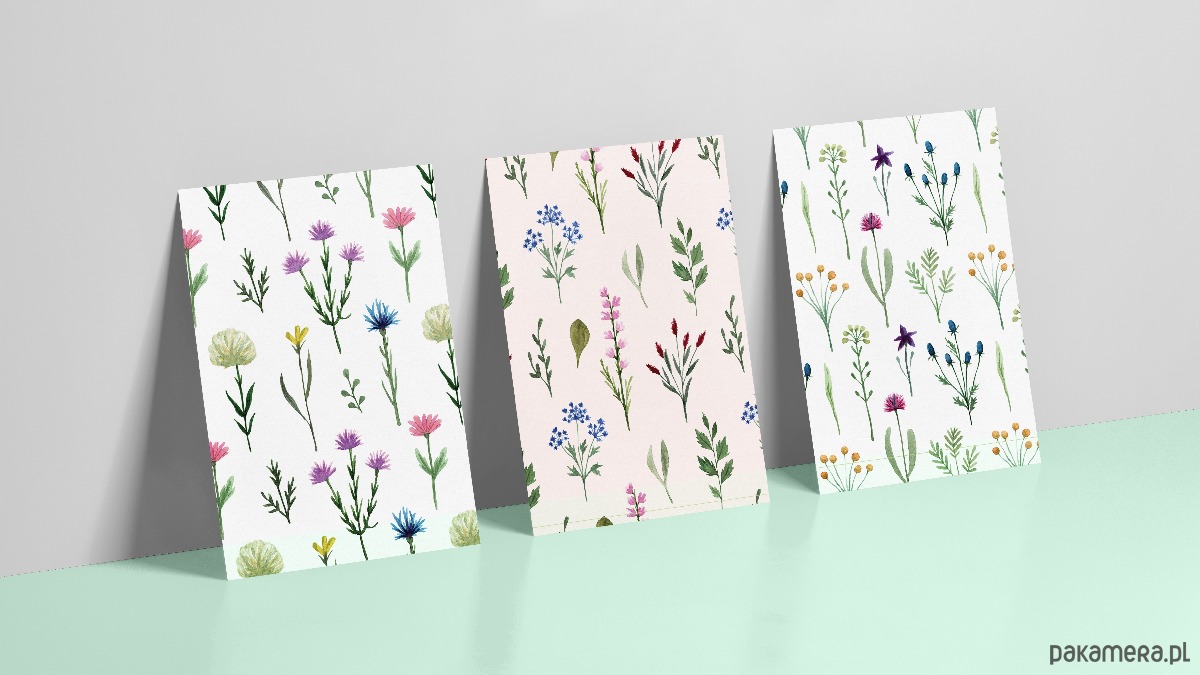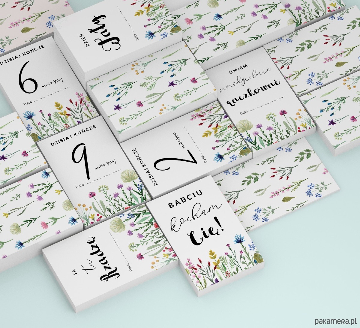 Każda karta ma wymiar 10,5cm x 14,8cm (A6), są wydrukowane w wysokiej jakości na grubym papierze. Nadruk dwustronny, z jednej strony kwiatowa łączka, z drugiej strony napis.