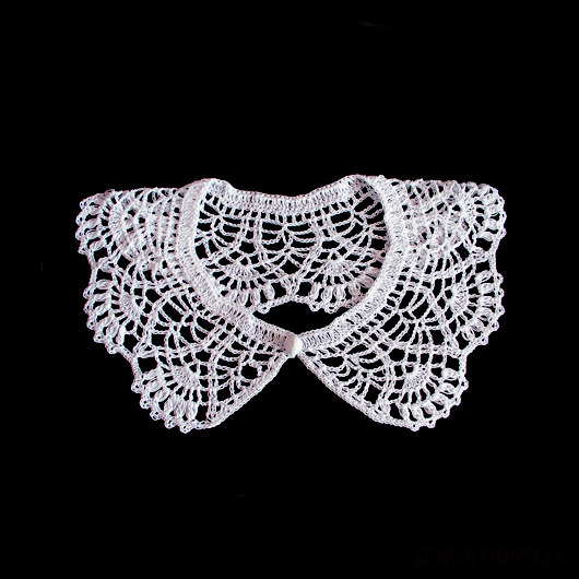 Uroczy koronkowy kołnierzyk wykonany na szydełku z kordonku w kolorze białym. Idealny do ozdobienia sweterka, sukienki. Zapinany na guziczek. Obwód 46cm. Prać ręcznie w temp. 30st.C, suszyć w stanie rozłożonym.