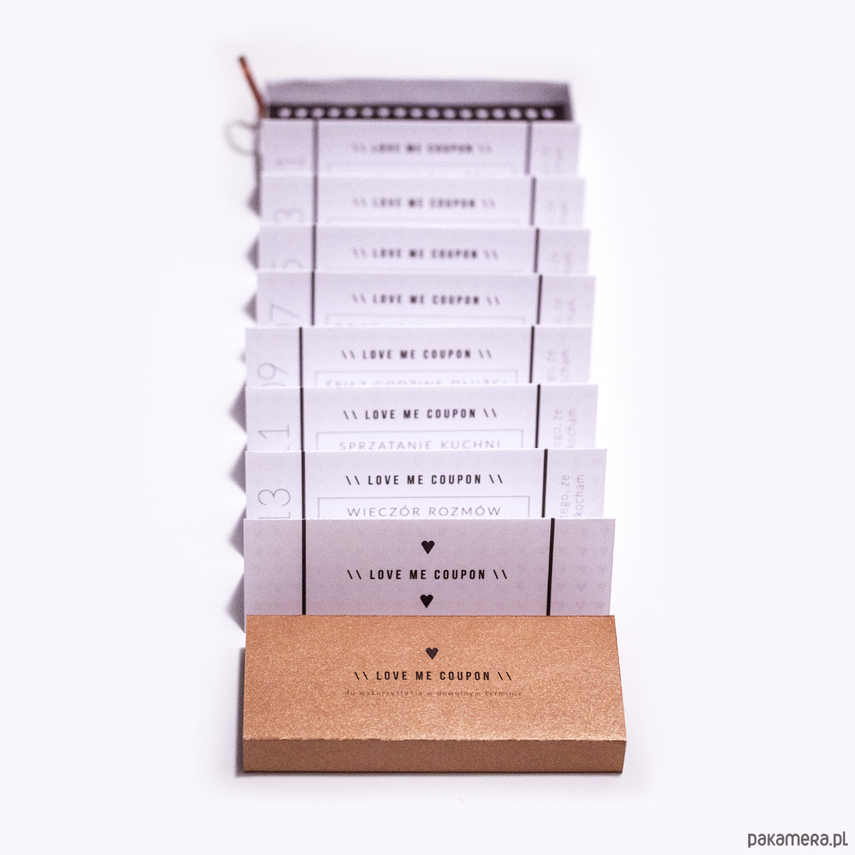 LOVE ME COUPON – kupony miłosne – to zestaw 14 kuponów prezentowych. Prezentami są przyjemności, które robisz dla ukochanej osoby. To np. wspólna kąpiel, władza nad pilotem, sprzątanie kuchni czy… DZIKA KARTA. Kupony zapakowane są w eleganckie, minimalistyczne pudełeczko. Posiadają perforację umożliwiającą odrywanie poszczególnych kart. Karty wydrukowane na grubym papierze satynowym.