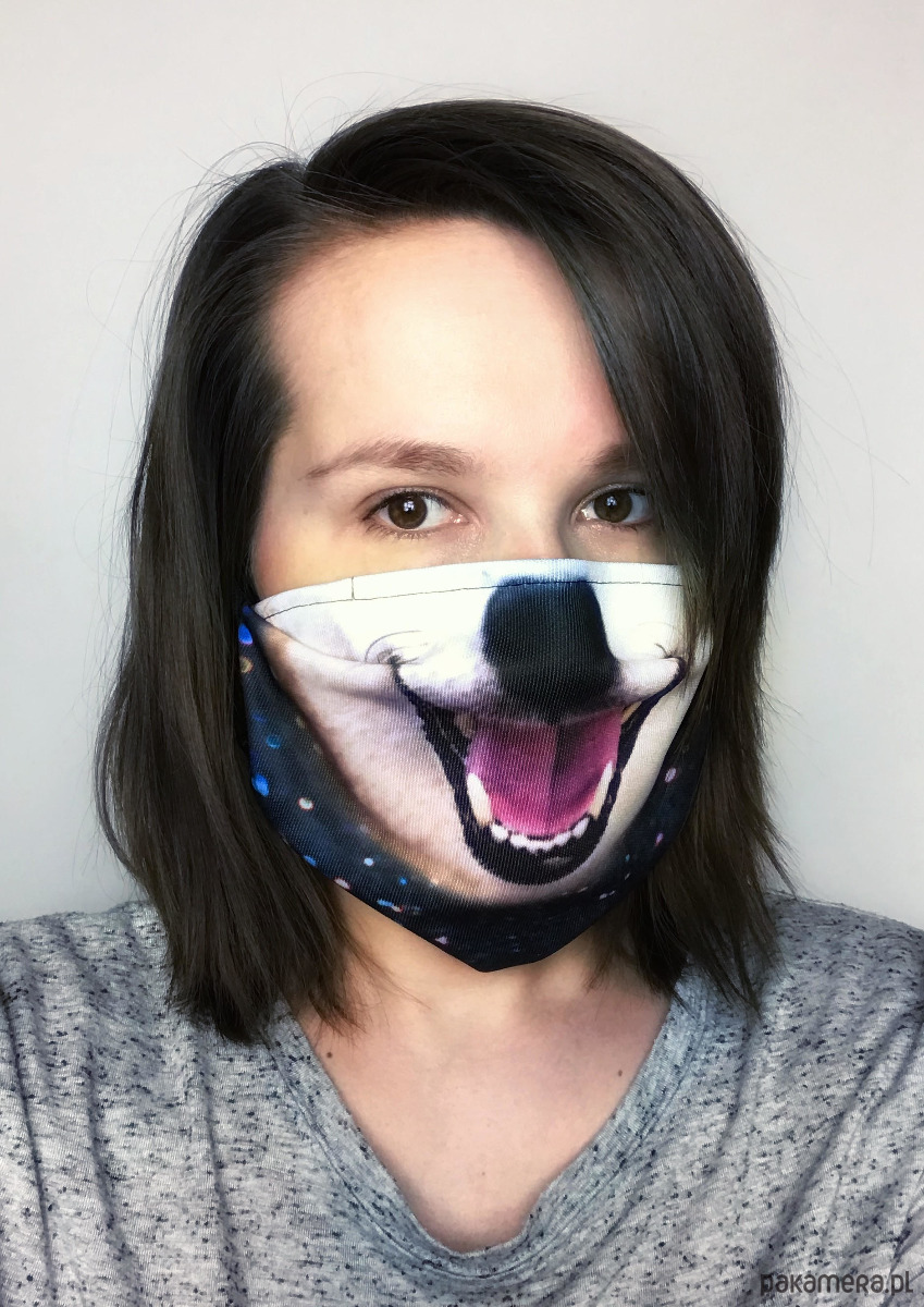 Na nosie posiada metalową blaszkę którą można dopasować do kształtu nosa.