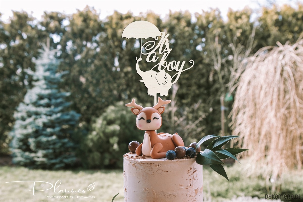 Wyjątkowy topper na Baby Shower - wykonany z wysokiej jakości sklejki z drzew liściastych o grubości 3 mm ozdobi tort lub inne słodkości.