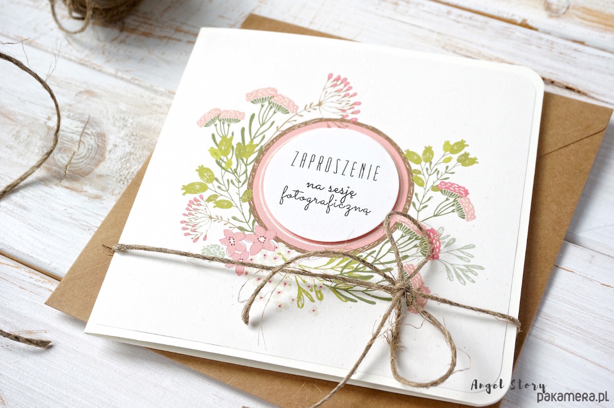 Zaproszenie na sesję foto z pięknym motywem roślinnym. Wewnątrz kieszonka wraz z treścią zaproszenia . Kremowa baza w rozmiarze 13,5x13,5cm. W zestawie brązowa koperta.