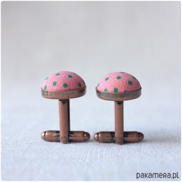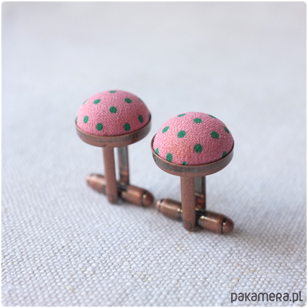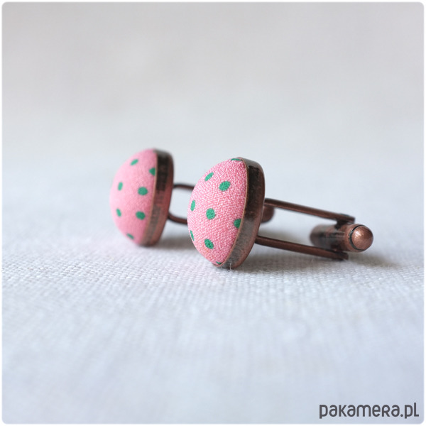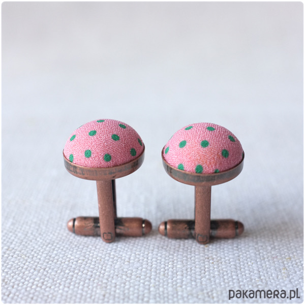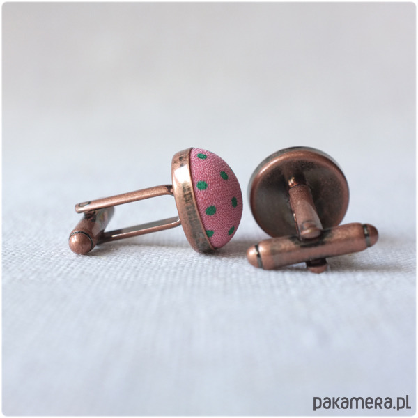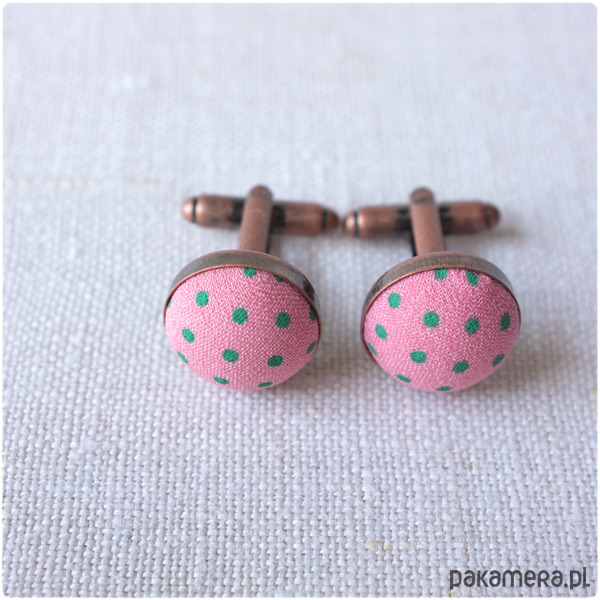 Wesołe, lekkie i nieduże spinki do mankietów w kolorze miedzi. Baza spinki ma 15 mm, średnica obciągniętego materiałem guziczka w groszki to 15 mm. Idealne na prezent dla Niego wraz z nadchodzącą wiosną! Na życzenie chętnie przygotuję spinki z prywatnym napisem lub zdjęciem lub innym kolorem guziczka, proszę wtedy o wcześniejszy kontakt mailowy.