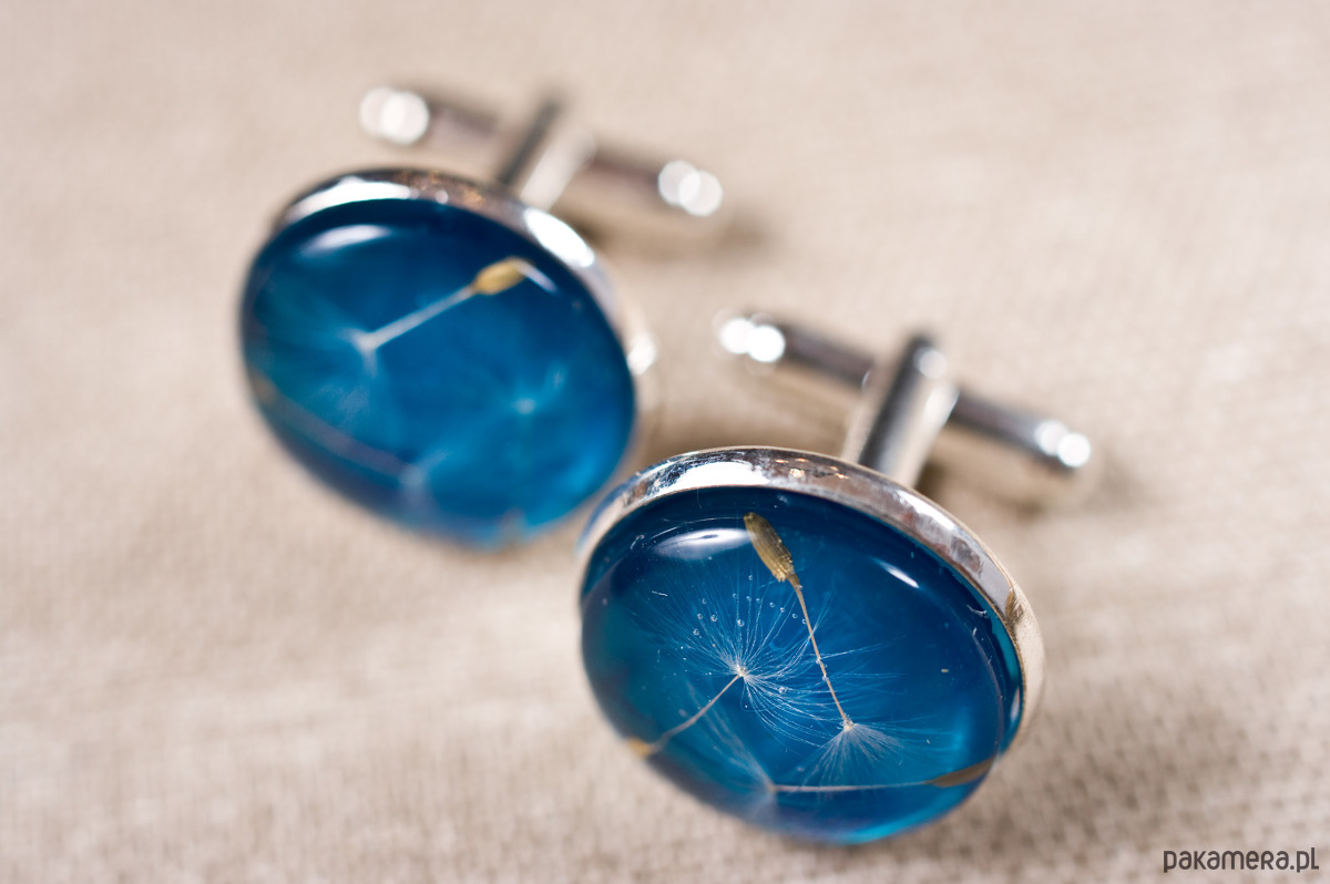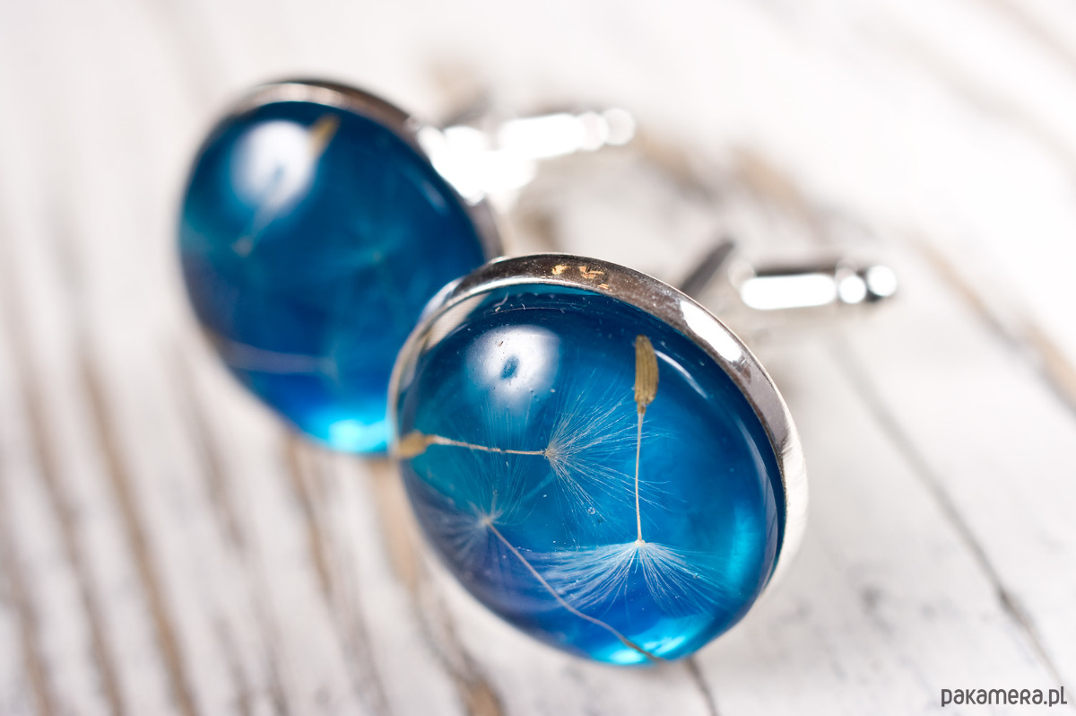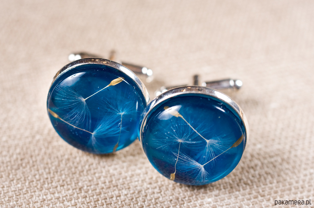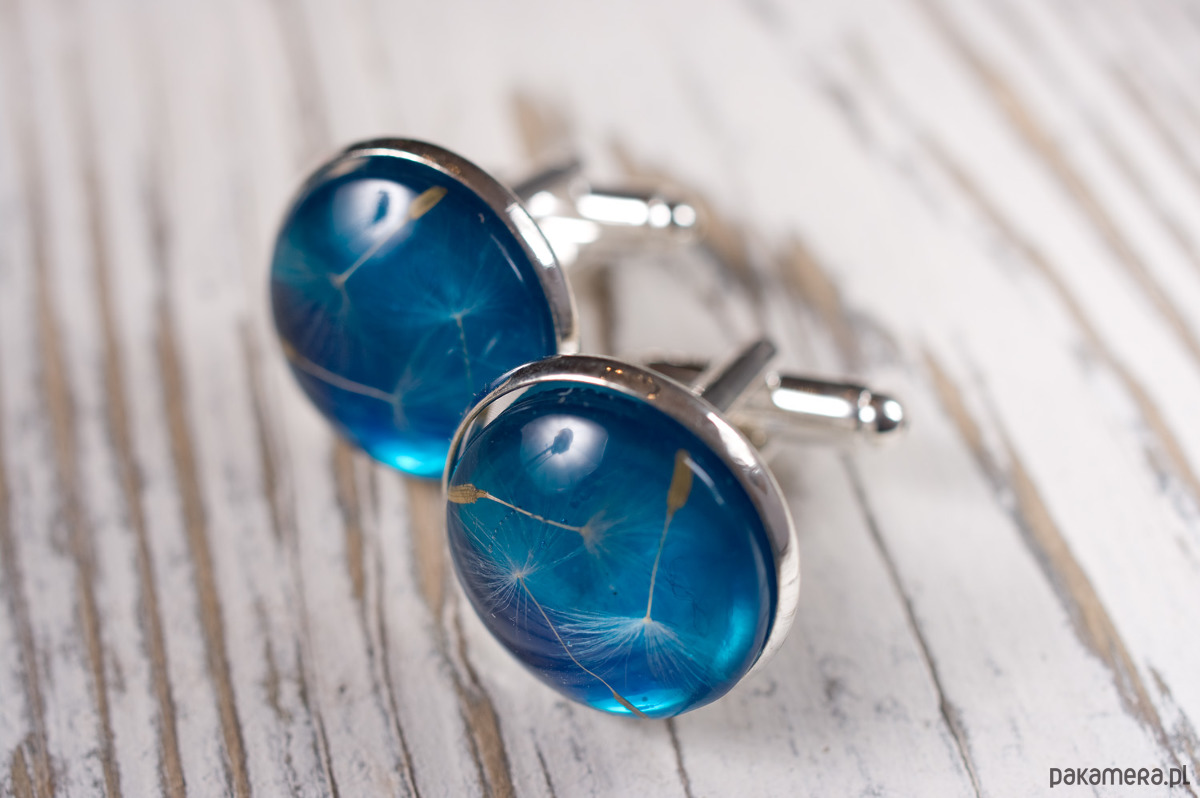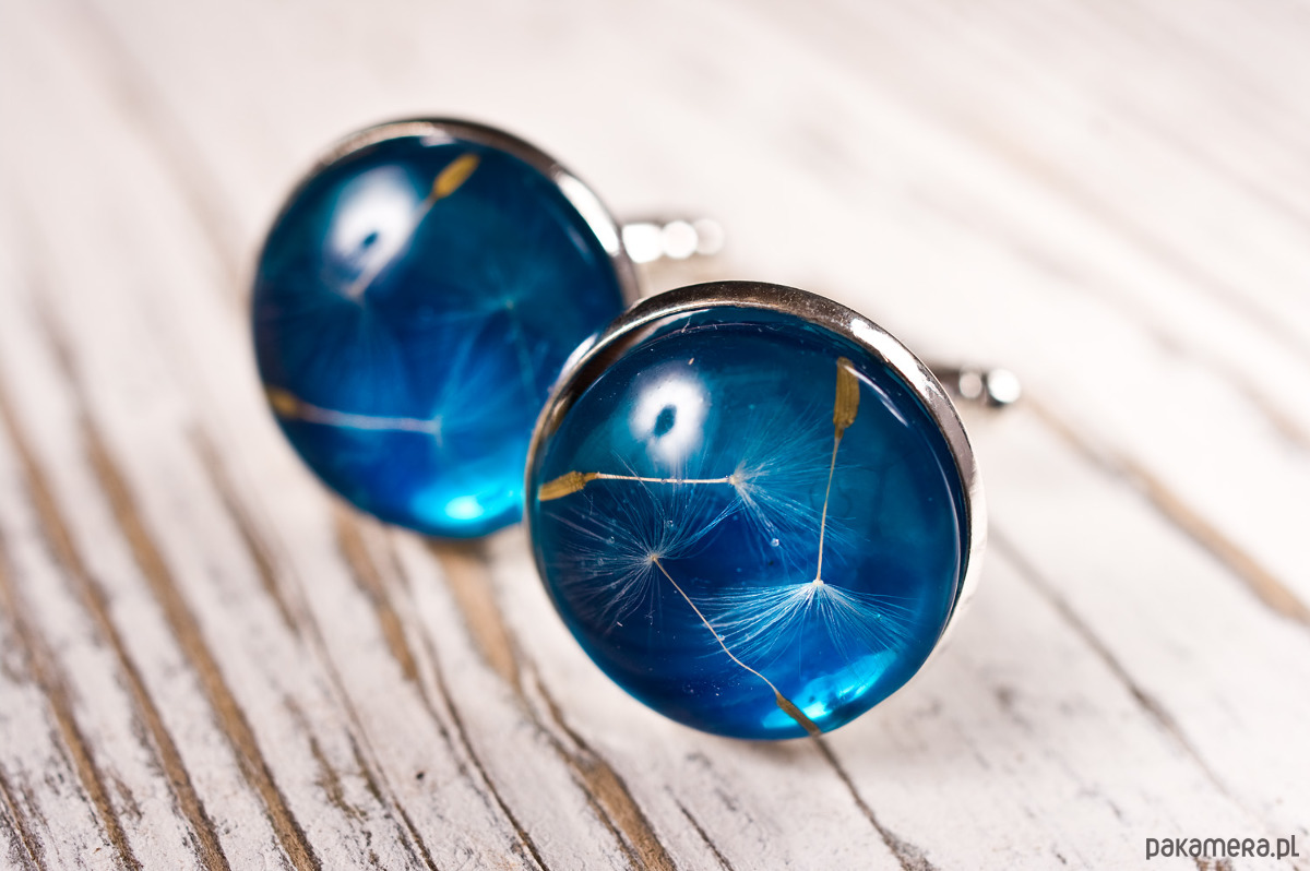 Spinki do mankietów z nasionkami dmuchawca na tle turkusowej żywicy. Kaboszony z żywicy wykonane ręcznie (każdy jest jedyny w swoim rodzaju). Zapięcie i oprawa wykonane ze stopu metali jubilerskich w kolorze srebra (bez niklu i ołowiu). Produkt jest lekki i elegancki. Nasza biżuteria oparta jest na autorskich projektach. Wymiary: średnica kaboszonów z żywicy: 18 mm. Wykorzystane materiały: żywica, metal, nasionka.