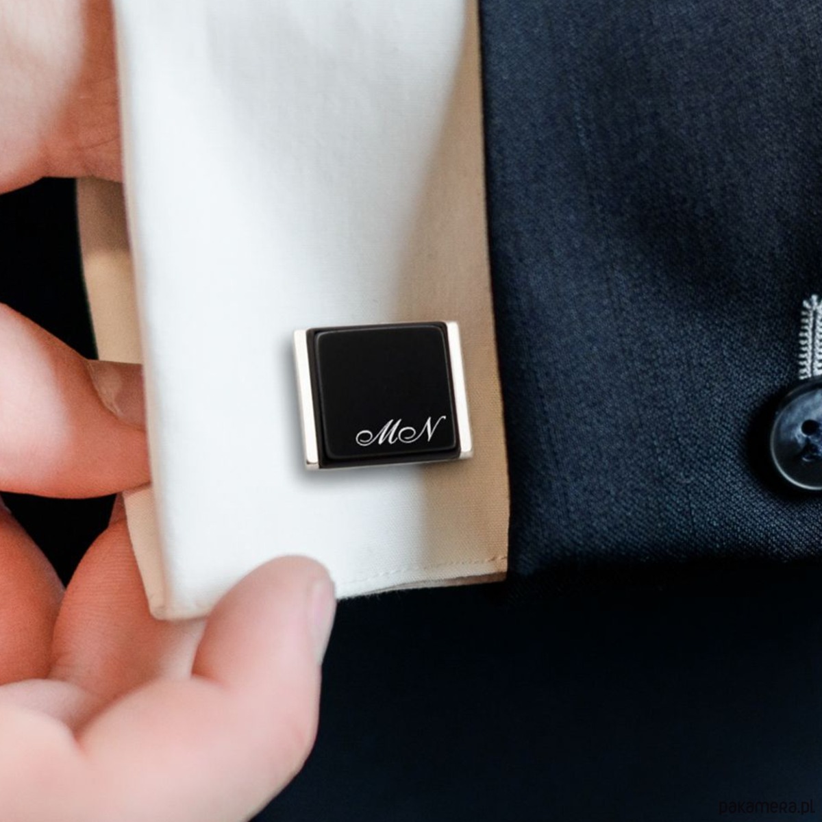 Grawerowane spinki do mankietów z Twoim grawerem na onyksie, wykonane ze srebra próby 925 oraz onyksu. Spinki do mankietów z grawerem to oryginalny pomysł na prezent dla mężczyzny, prezent urodzinowy, prezent dla pana młodego lub idealny prezent na rocznicę ślubu.