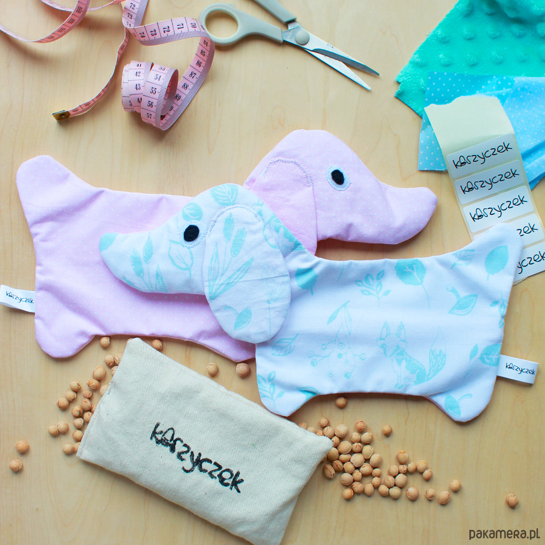 Termofor w kształcie psa. Wkład termoforka zawiera suszone pestki wiśni (istnieje także możliwość wyboru wkładu z dodatkiem suszonej lawendy). Termofor wykonany z bawełny oraz minky bezpiecznych dla dzieci ze wstawkami z filcu. Głowa psa wypełniona watoliną. Termofor nadaje się zarówno na okłady chłodne przy stłuczeniach (schładzając w zamrażarce), jak i ciepłe (podgrzewając w piekarniku lub mikrofalówce) na bóle brzucha lub kolki.