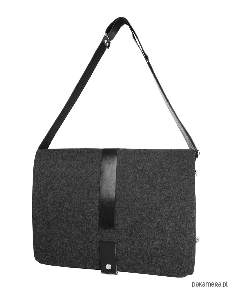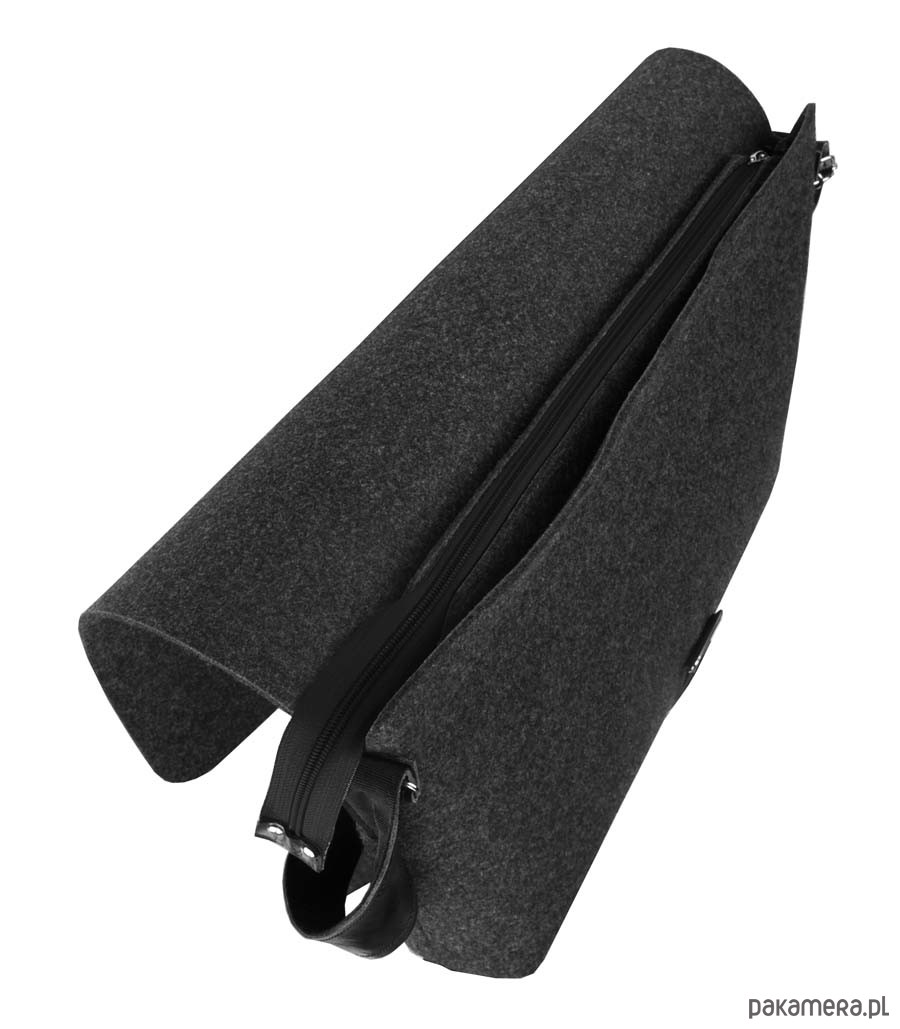 Torba zapinana na czarny zamek. Teczka pomieści poziomo laptopa 15 cali.