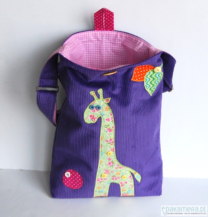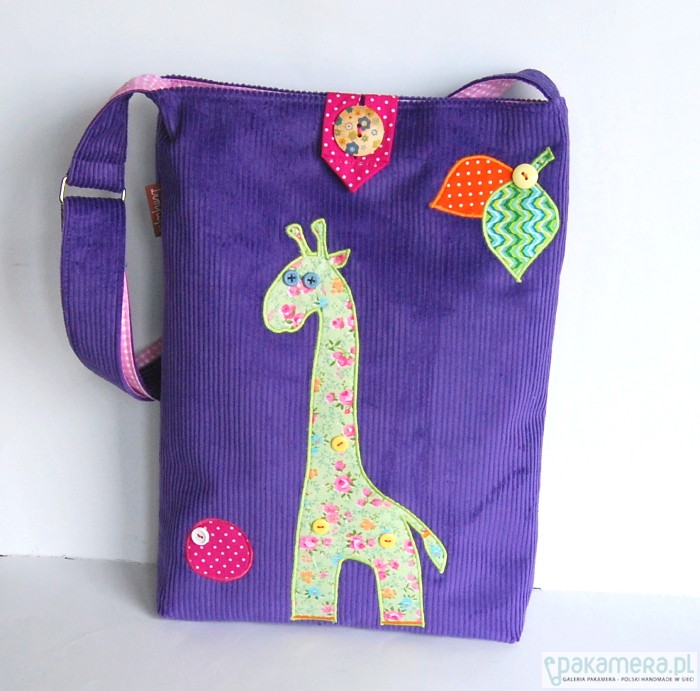 Torba dla dziewczynki, jest uszyta z fioletowego sztruksu. Osadzona na podszewce. Wewnątrz - mała kieszonka. Torebka jest udekorowana materiałową aplikacją przedstawiającą żyrafkę w kolorze pistacjowym. Idealna w roku szkolnym na zajęcia dodatkowe, na które uczęszcza dziecko (swobodnie mieści się format A4), do noszenia zarówno przez ramię, jak na ramieniu. Leciutka i bardzo dekoracyjna :) Zapięcie - na patkę z guzikiem. Wymiary: 29 x 36, uchwyt regulowany - ok. 50 - 100 cm. Polecam pranie ręczne, prasowanie od strony podszewki.. Termin realizacji zamówienia to 1-2 dni.