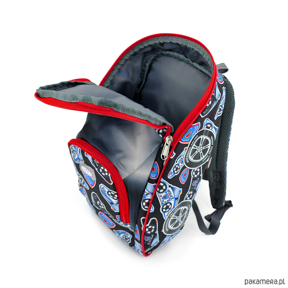 Najwyższej jakości markowy plecak średniej wielkości brytyjskiej firmy Hugger jest bardzo lekki, ale pojemny, wytrzymały, kształtem zbliżony do samochodu. Posiada jedną dużą główną komorę i mniejszą kieszeń z przodu zapinaną na duży zamek, a także regulowane szelki i jest wyposażony w zamek błyskawiczny marki YKK. Wygodne pasy ramienne mają regulowane ramiączka i wyściełane są oddychającą siateczką. Wraz z klamrą piersiową tworzą szelki bezpieczeństwa. Plecak ma też górny uchwyt. Jest idealny do żłobka, przedszkola, na wycieczki, spacery, wakacje.