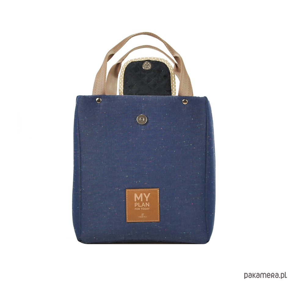 Torebka lunch bag posiada klapkę, w której umieszczony został magnes stanowiący zapięcie torebki.
