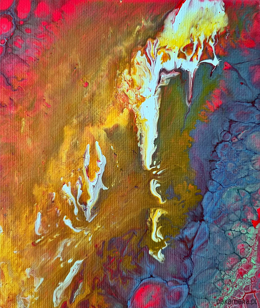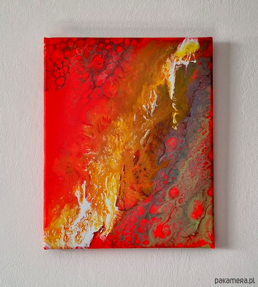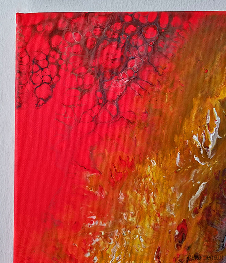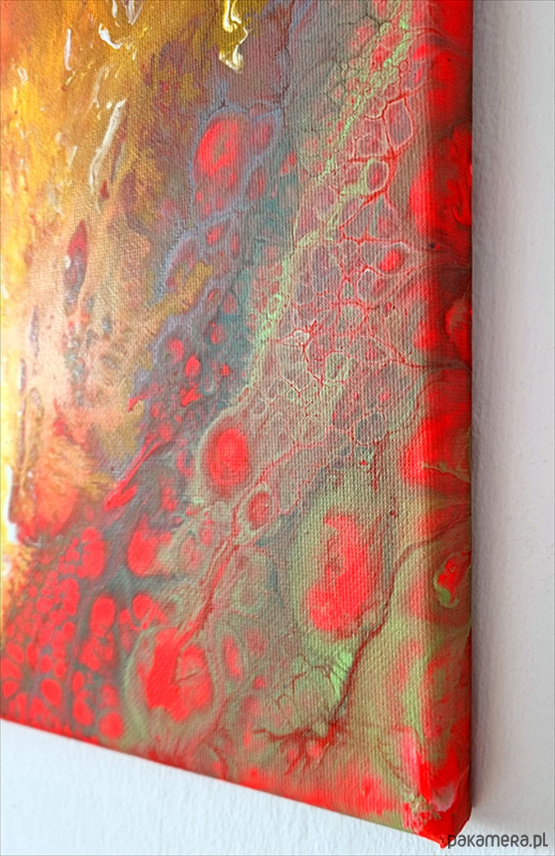 Akryl na płótnie wykonany metodą pouringu, czyli wylewania farb. W pięknej, bardzo intensywnej i dynamicznej kolorystyce.