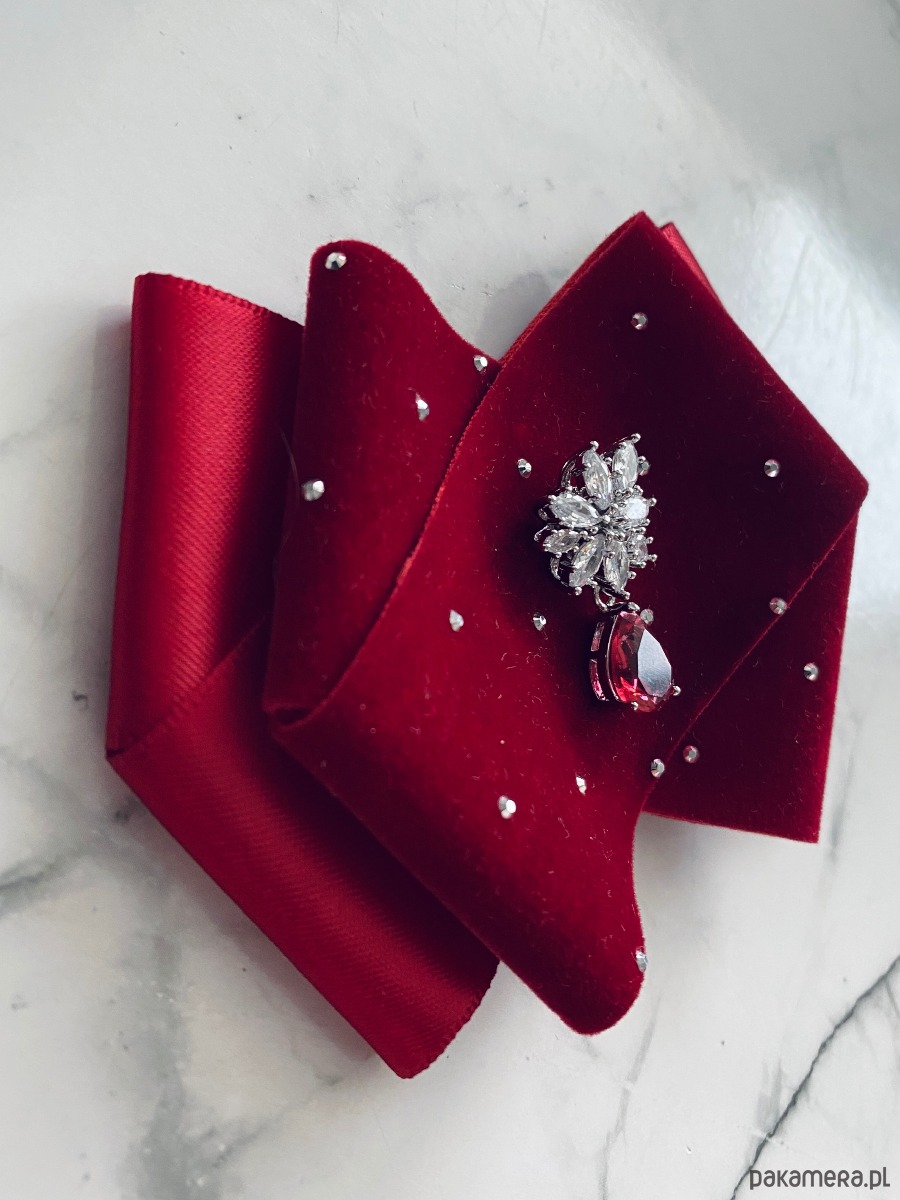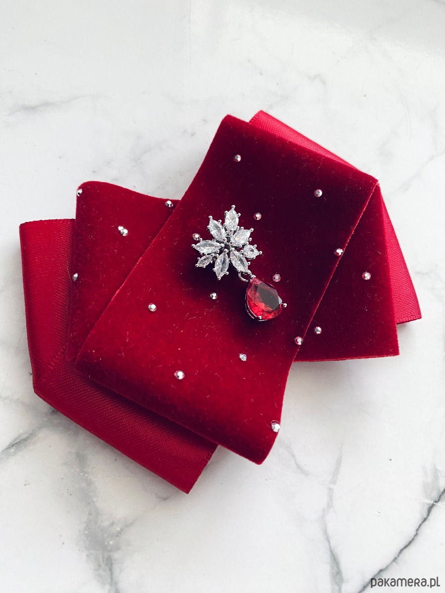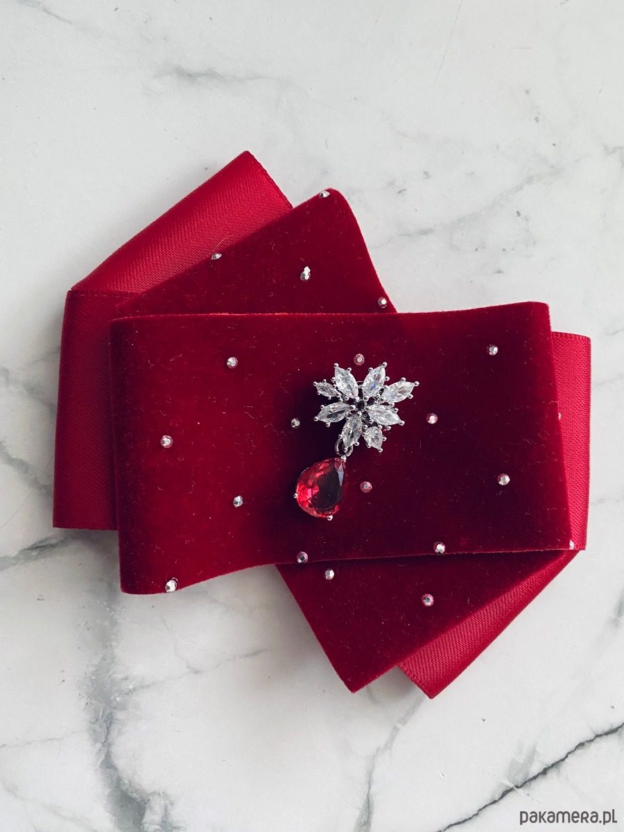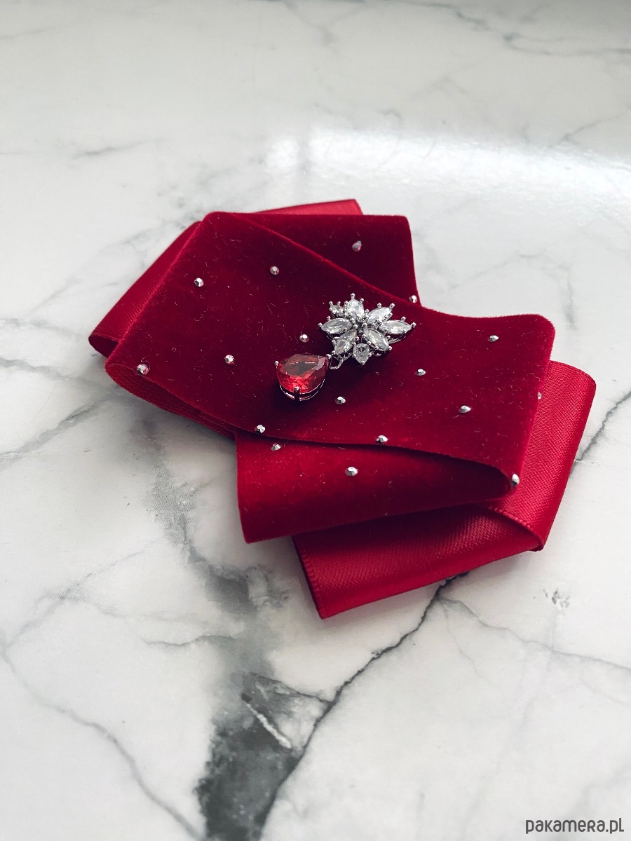 Brosza z dodatkiem wstążki wykonanej z aksamitu z drobnymi mieniącymi kryształkami. Do tego delikatna ozdoba biżuteryjna. Duet idealny!