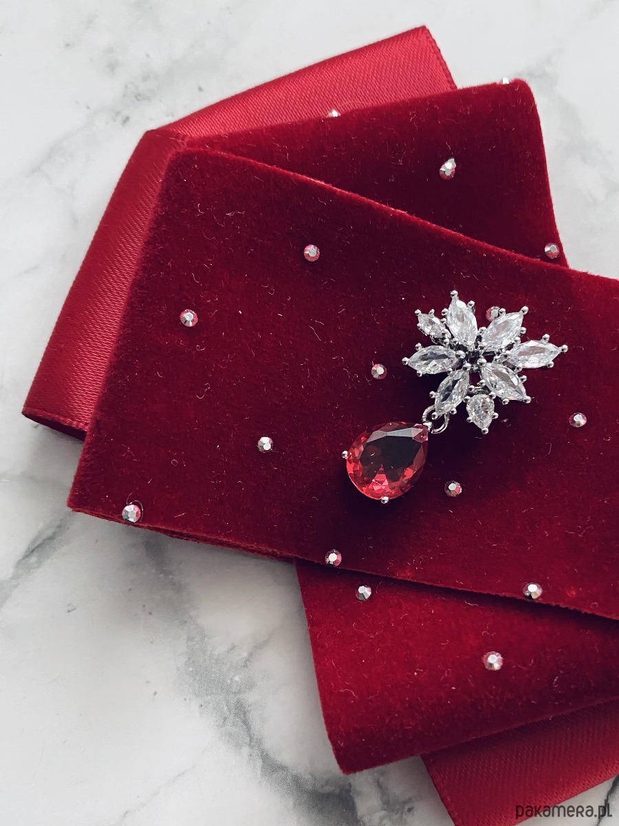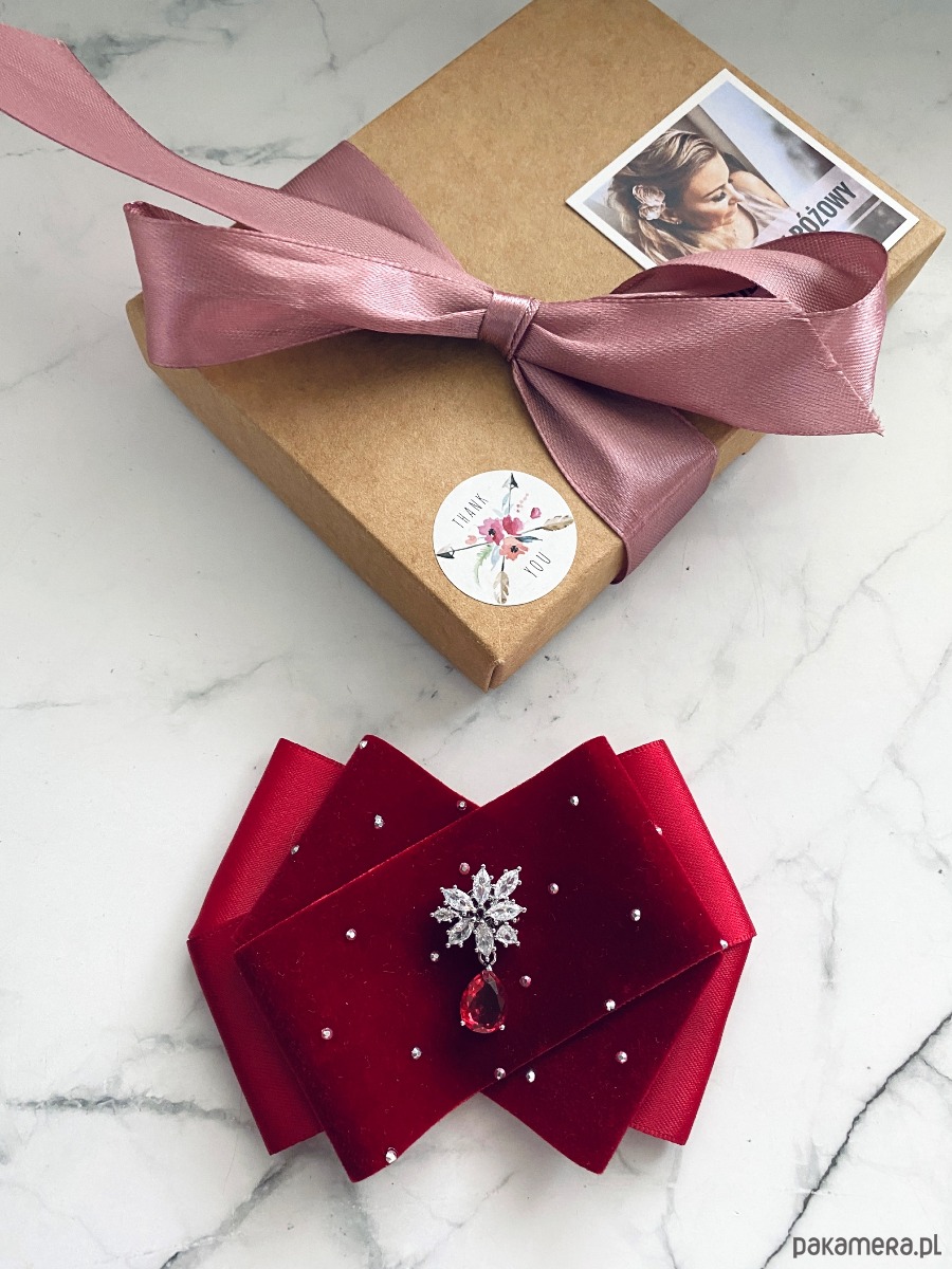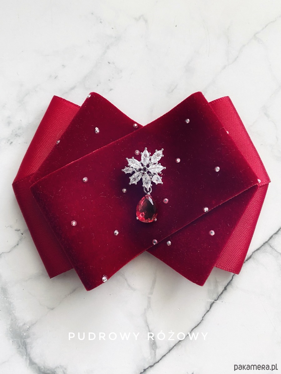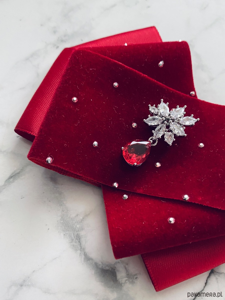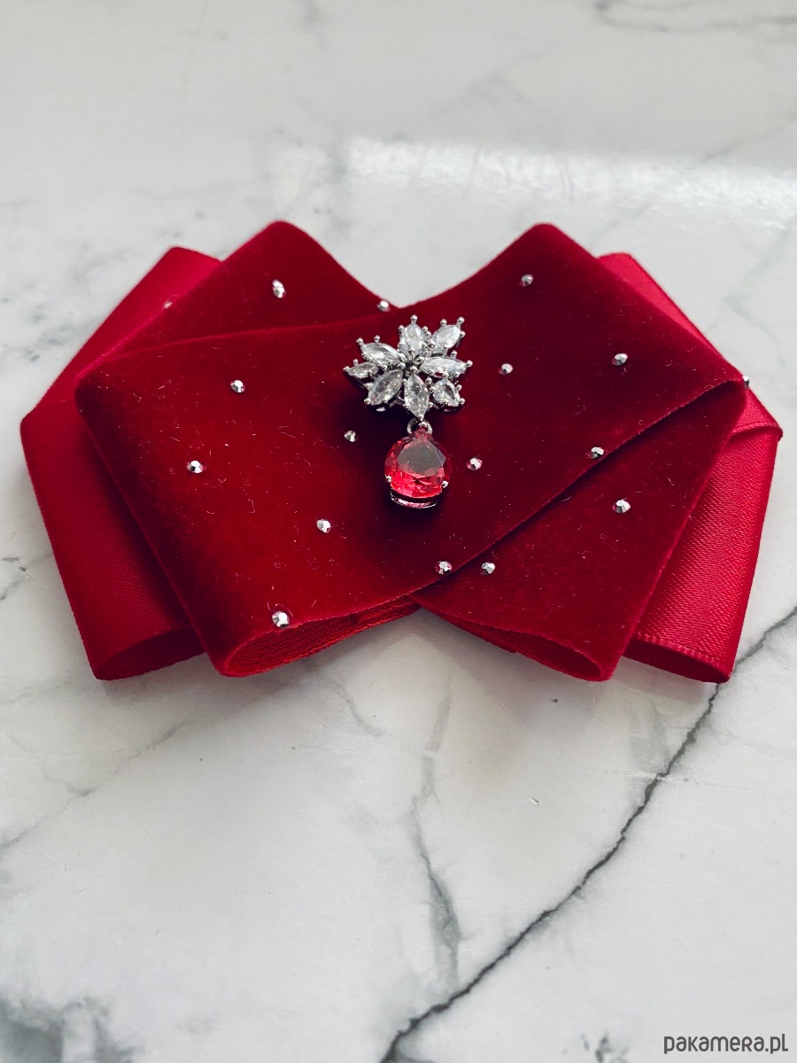 Brosza z dodatkiem wstążki wykonanej z aksamitu z drobnymi mieniącymi kryształkami. Do tego delikatna ozdoba biżuteryjna. Duet idealny!