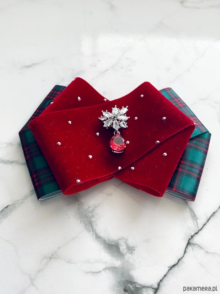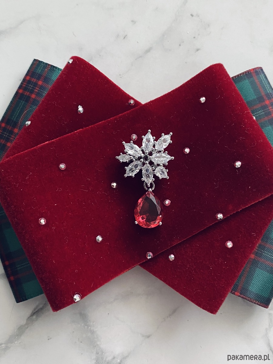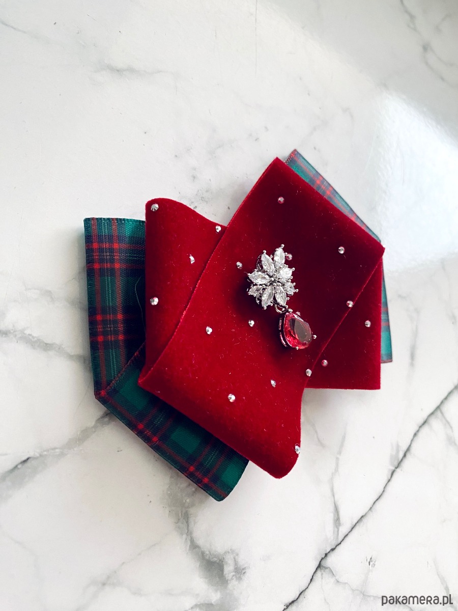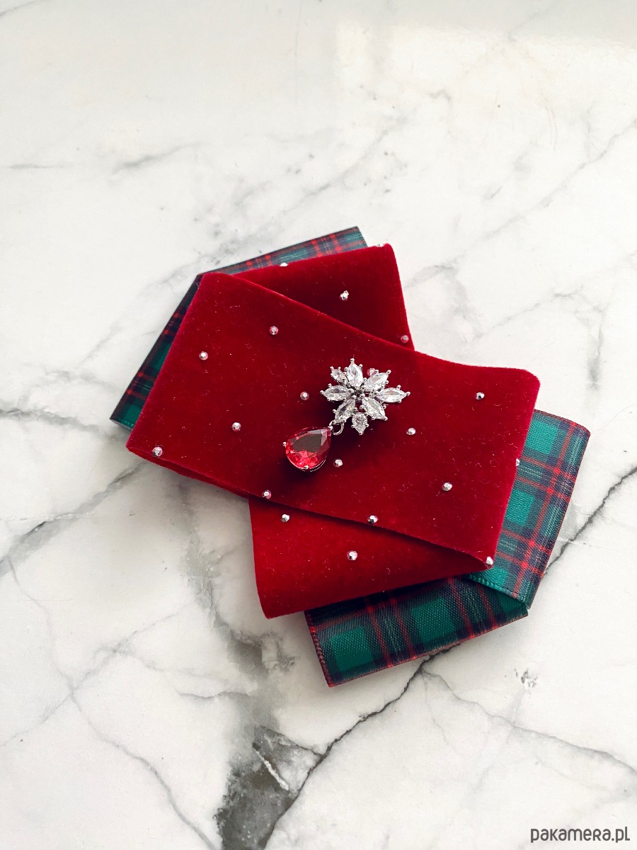 Brosza z dodatkiem wstążki wykonanej z aksamitu z drobnymi mieniącymi kryształkami. Do tego delikatna ozdoba biżuteryjna. Duet idealny!