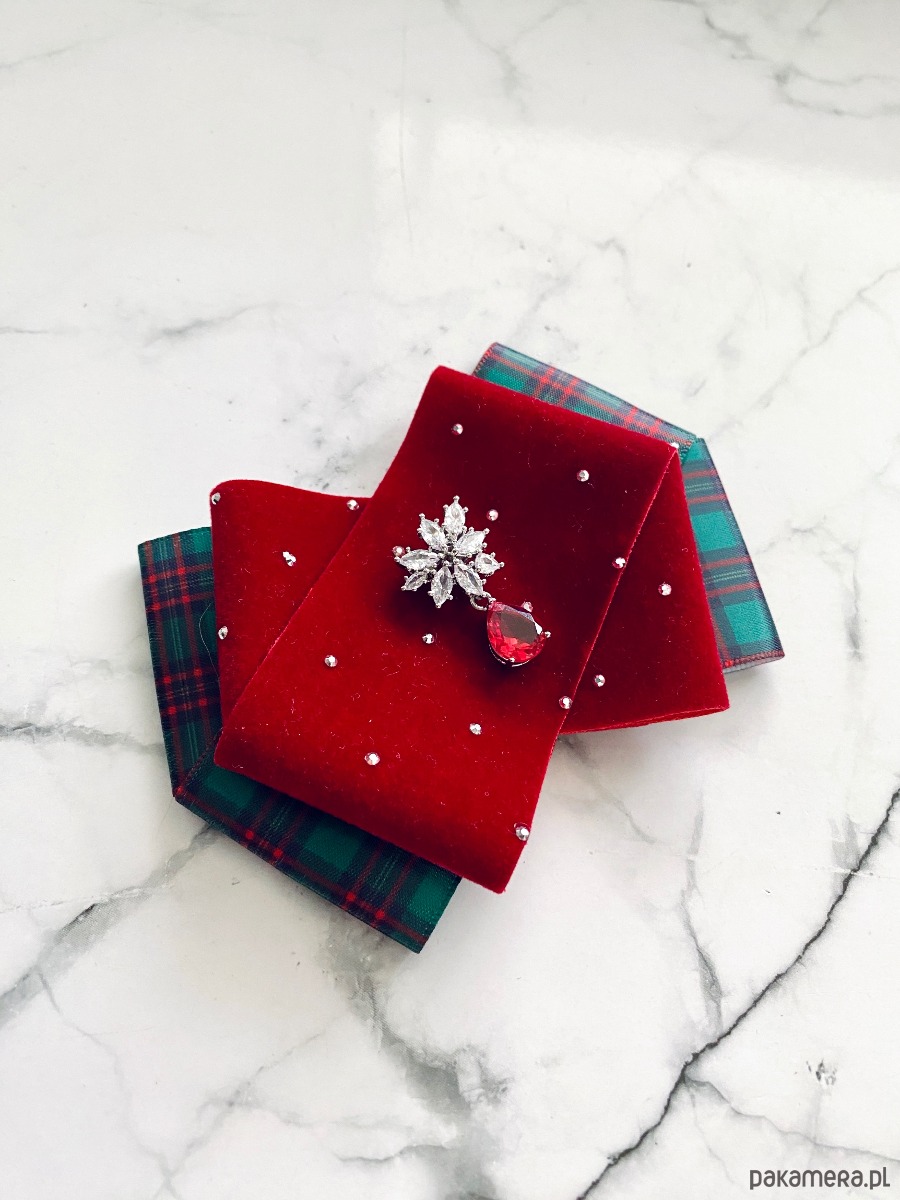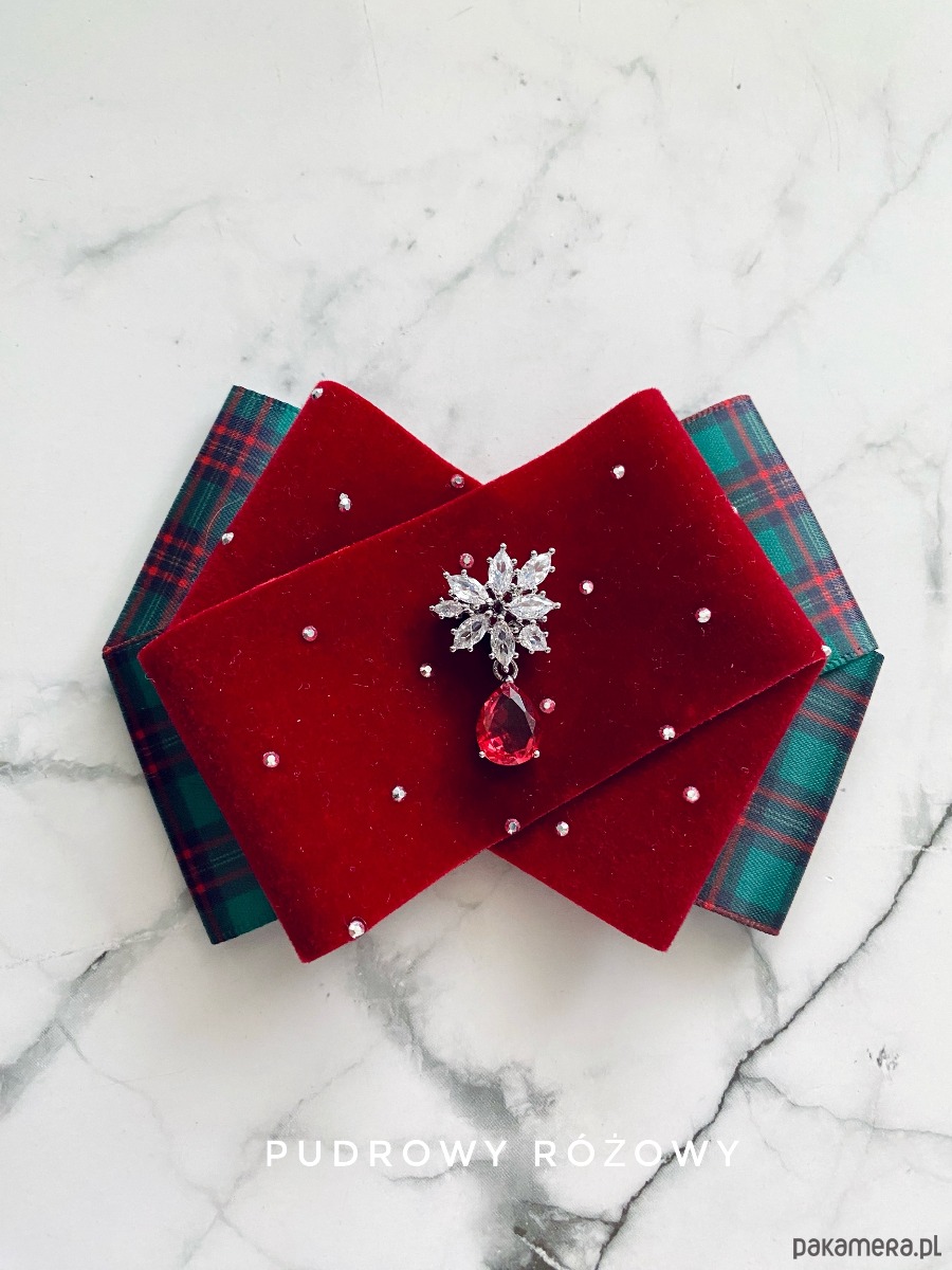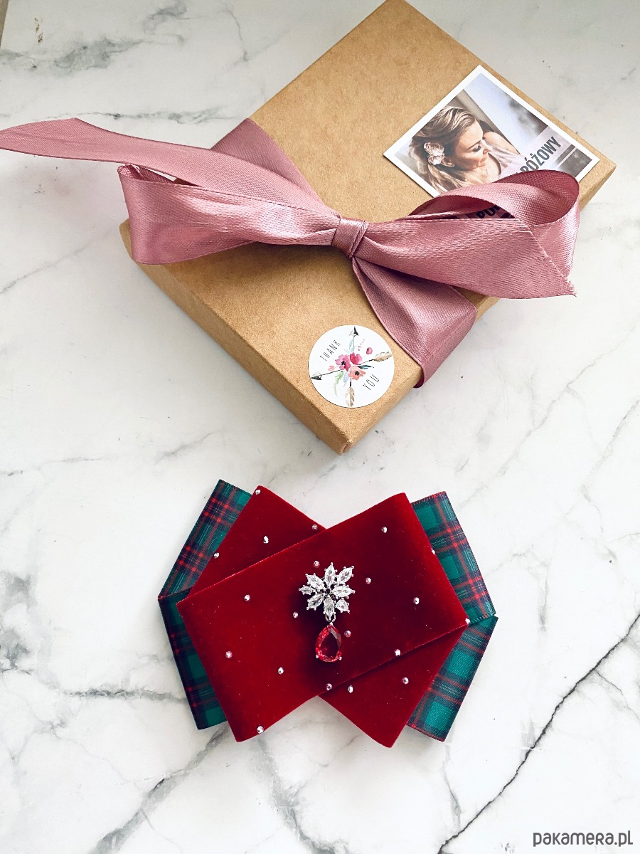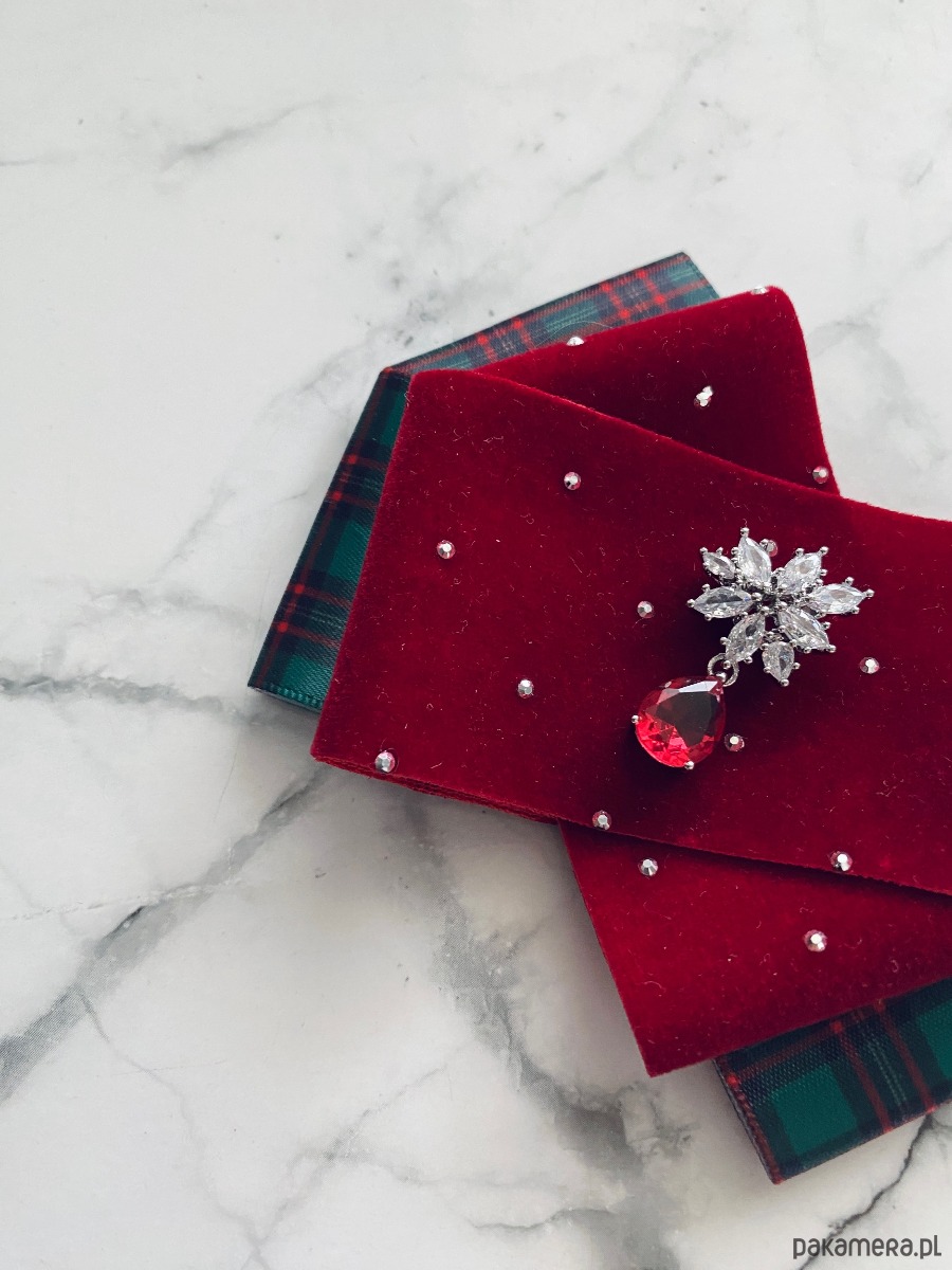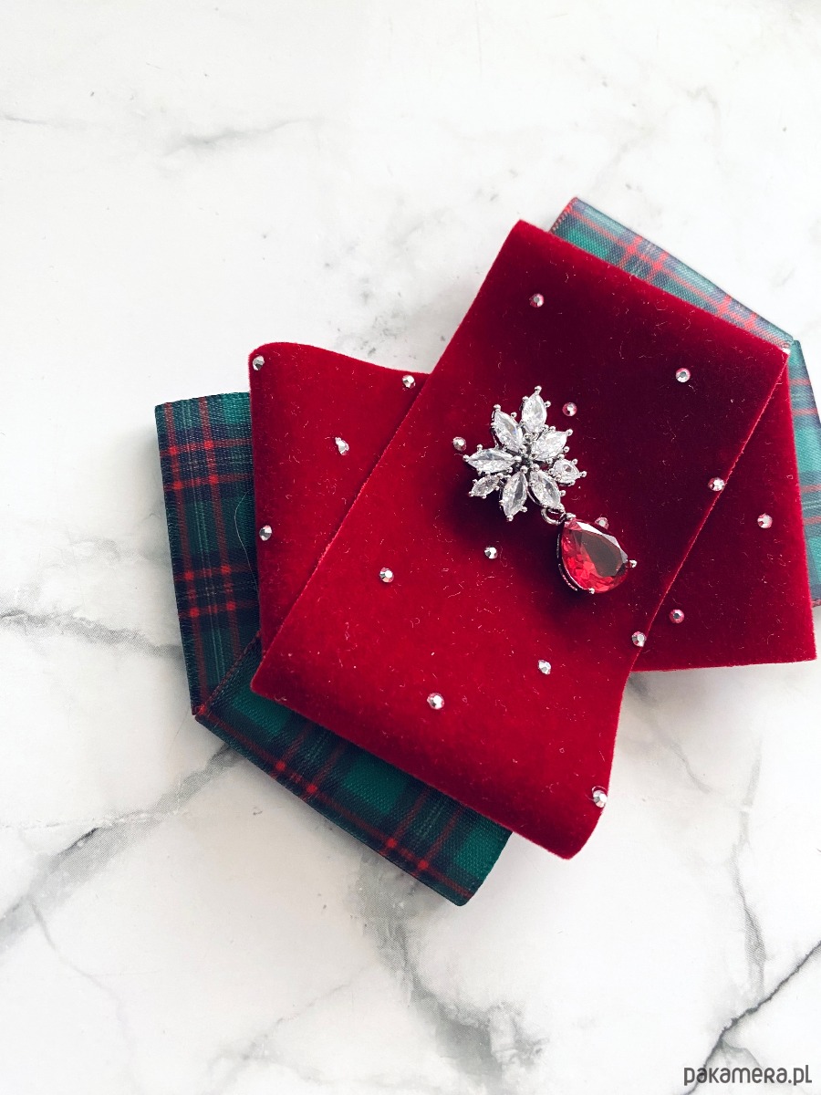 Brosza z dodatkiem wstążki wykonanej z aksamitu z drobnymi mieniącymi kryształkami. Do tego delikatna ozdoba biżuteryjna. Duet idealny!