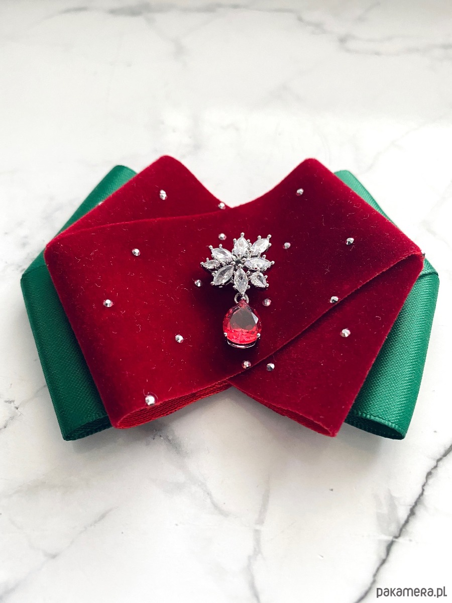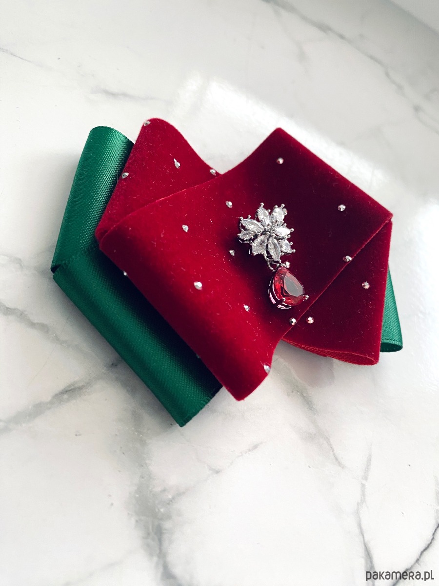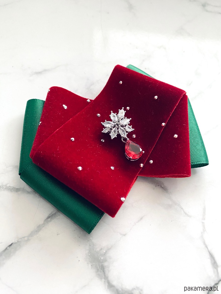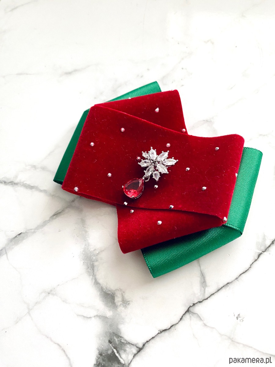 Brosza z dodatkiem wstążki wykonanej z aksamitu z drobnymi mieniącymi kryształkami. Do tego delikatna ozdoba biżuteryjna. Duet idealny!